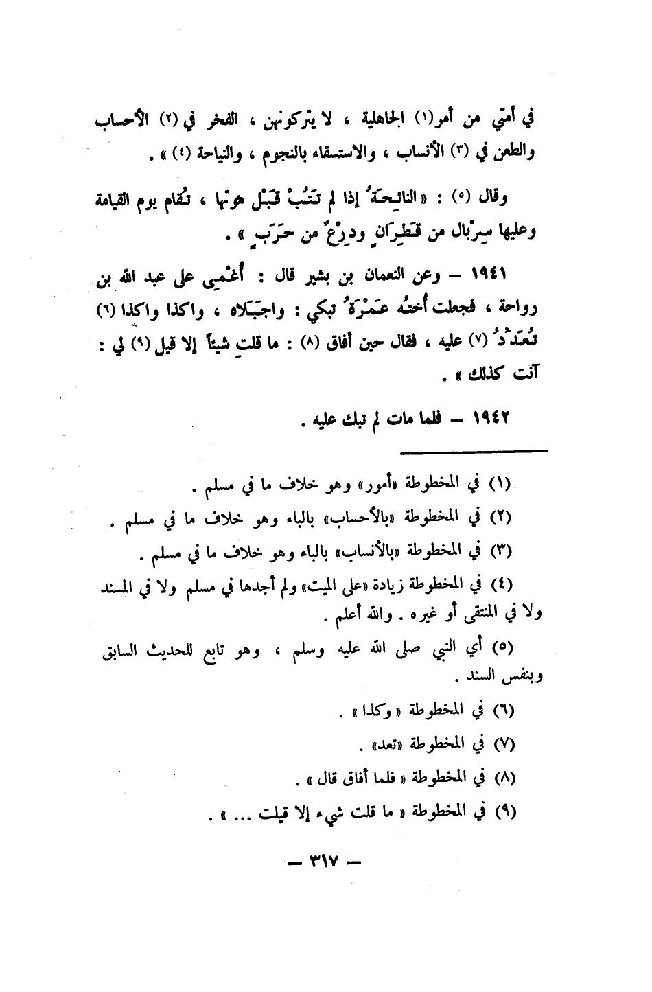 1941- وعن النعمان بن بشير قال: "أُغمي على عبد الله بن رواحة، فجعلت أُختُه عَمْرَةُ تبكي: واجَبَلاه! واكذا واكذا! 5 تُعَدِّدُ 6 عليه. فقال حين أفاق: 7 ما قلتِ شيئاً إلا قيل 8 لي: آنت كذلك".
