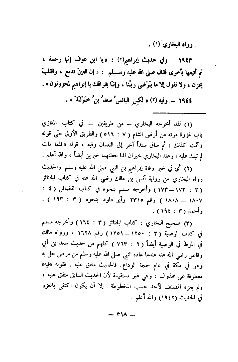 3 صحيح البخاري: كتاب الجنائز (3/164) ، وأخرجه مسلم في كتاب الوصية (3/1250، 1251) رقم (1628) , ورواه مالك في الموطإ في الوصية أيضاً (2/763) ، كلهم من حديث سعد بن أبي وقاص، رضي الله عنه، عندما عاده النبي ? من مرض حل به وهو في مكة في عام حجة الوداع. فالحديث متفق عليه. فقوله: (فيه) معطوفة على محذوف, وهي غير مستقيمة، لأن الحديث السابق متفق عليه, ولم يعزه المصنف لأحد حسب المخطوطة، إلا أن يكون اكتفى بالعزو في الحديث (1942) . والله أعلم.