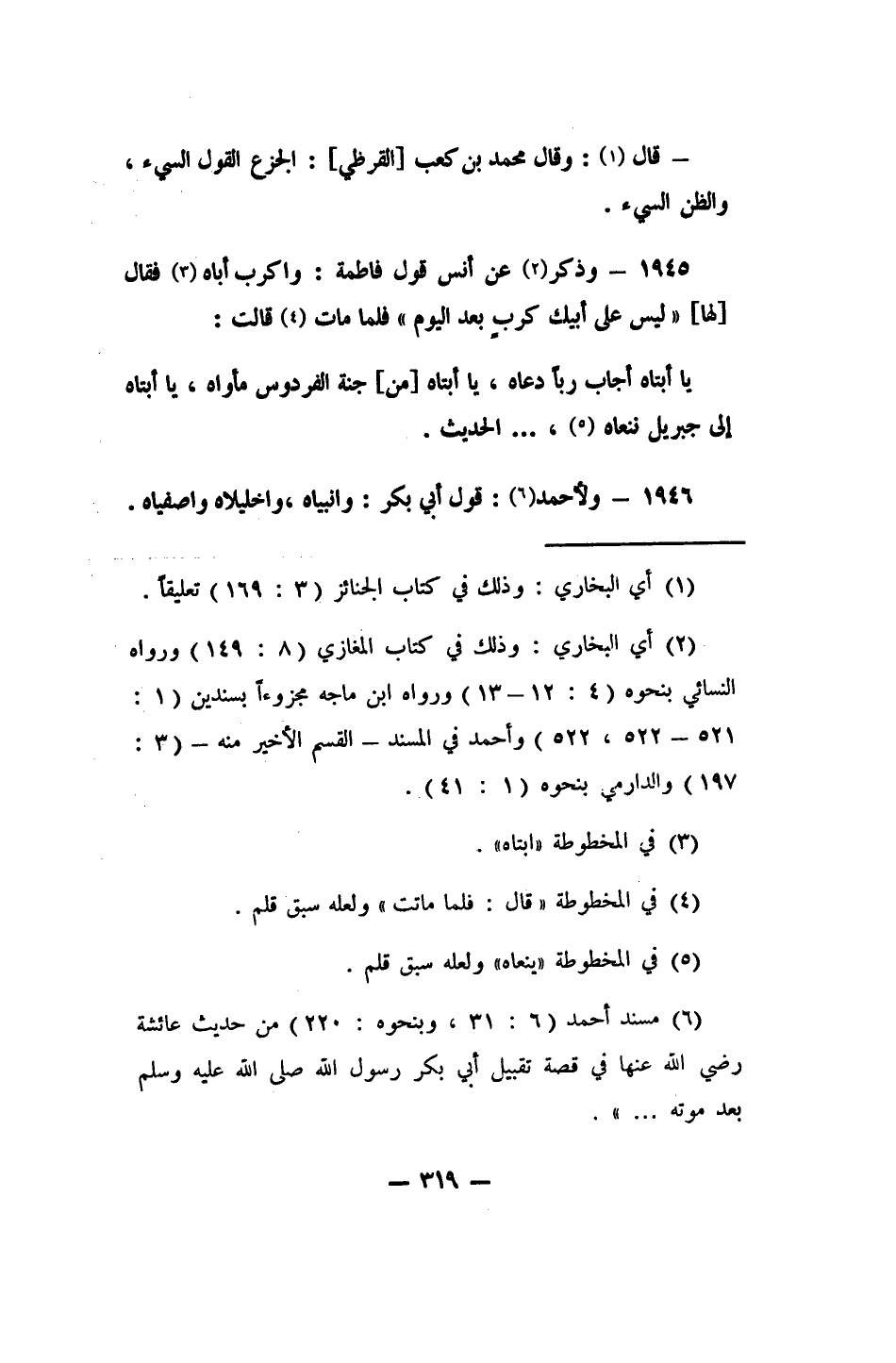 1945- وذكر 2 عن أنس قول فاطمة: "واكرب أباه! 3 فقال [لها] : ليس على أبيك كربٌ بعد اليوم. فلما مات 4 قالت: يا أبتاه أجاب رباً دعاه، يا أبتاه [من] جنة الفردوس مأواه، يا أبتاه إلى جبريل ننعاه" 5 الحديث.