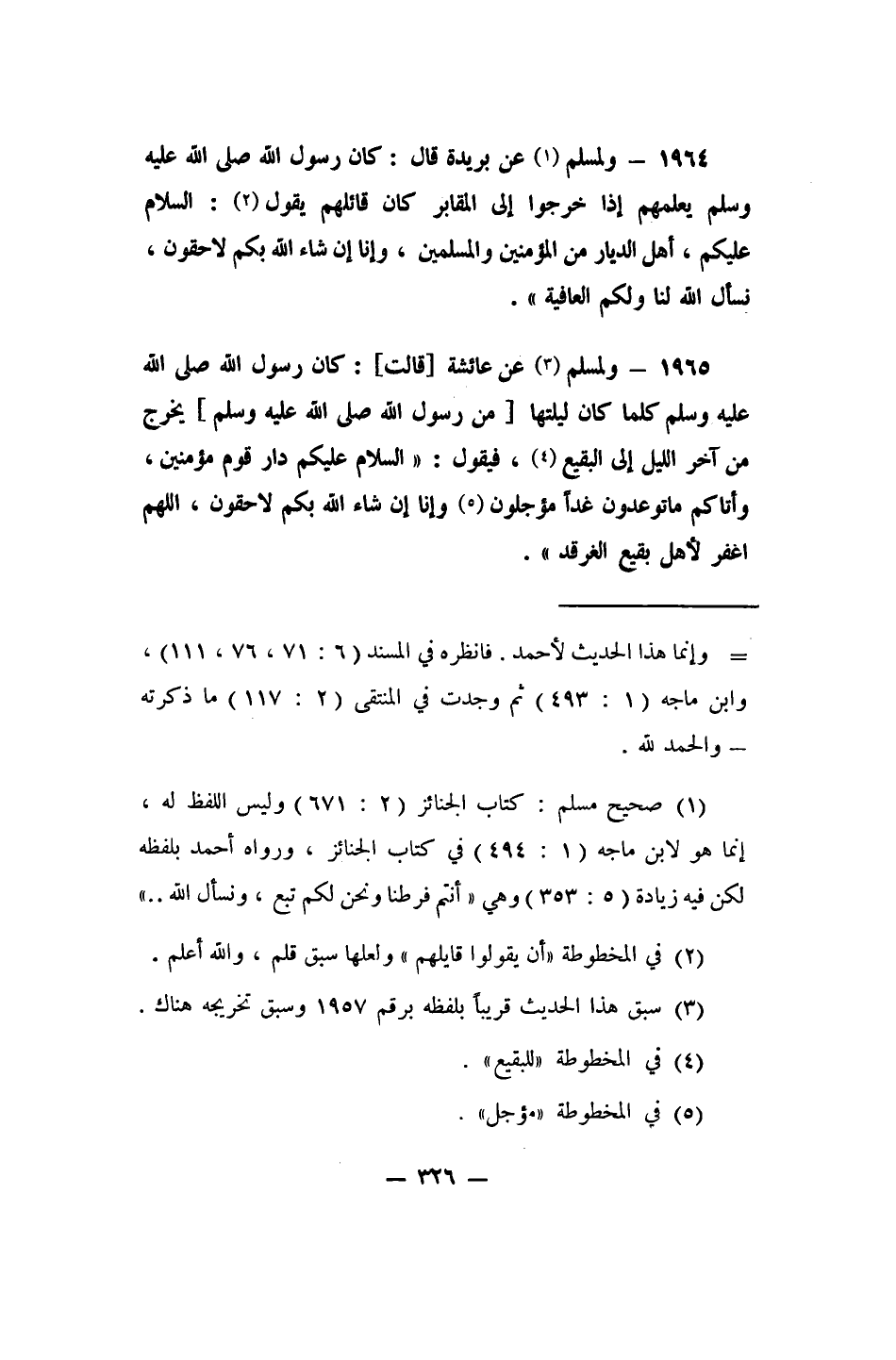 1964- ولمسلم 1 عن بريدة قال: "كان رسول الله صلى الله عليه وسلم يعلمهم إذا خرجوا إلى المقابر كان قائلهم يقول: 2 السلام عليكم، أهل الديار من المؤمنين والمسلمين، وإنا إن شاء الله بكم لاحقون. نسأل الله لنا ولكم العافية".