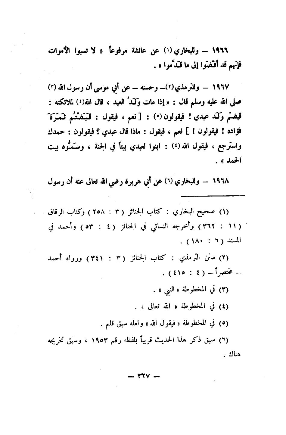 1966- وللبخاري 1 عن عائشة، مرفوعاً: "لا تسبوا الأموات! فإنهم قد أفْضَوا إلى ما قَدَّموا".