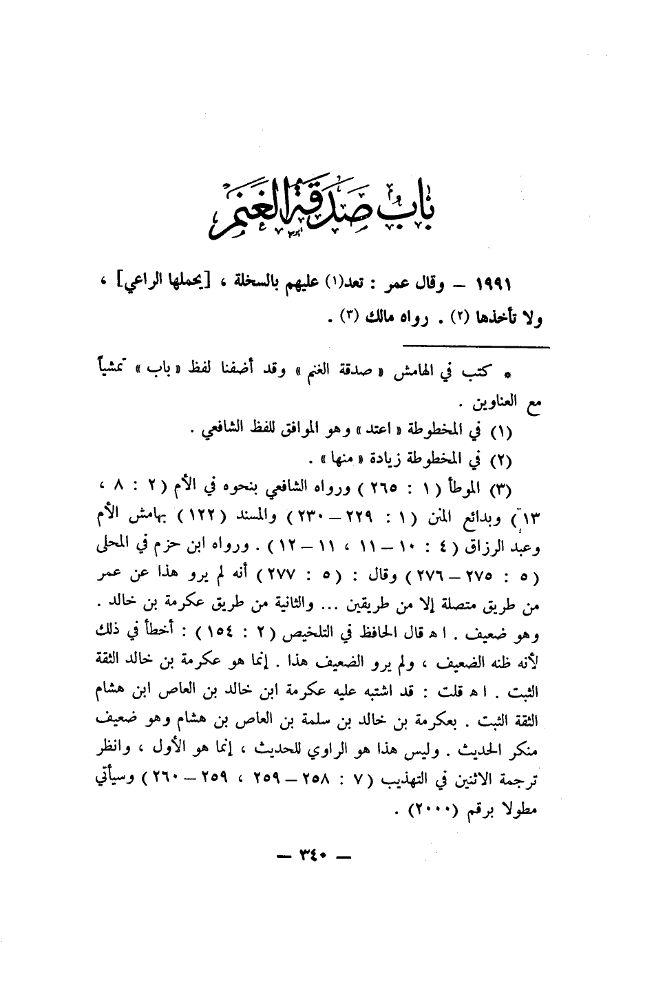 1991- وقال عمر: "تعد 2 عليهم بالسخلة، [يحملها الراعي] ، ولا تأخذها" 3. رواه مالك 4.