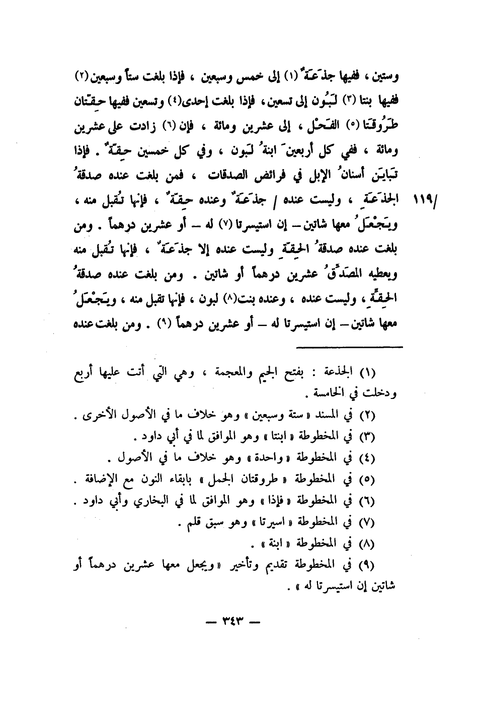وستين، ففيها جذَعَةٌ 1 إلى خمس وسبعين. فإذا بلغت ستاً وسبعين، 2 ففيها بنتا 3 لَبُون إلى تسعين. فإذا بلغت إحدى 4 وتسعين، ففيها حِقّتان طَرُوقَتا 5 الفَحْل، إلى عشرين ومائة. فإن 6 زادت على عشرين ومائة، ففي كل أربعينَ ابنةُ لَبون، وفي كل خمسين حِقّةٌ. فإذا تَبايَن أسنانُ الإبل في فرائض الصدقات، فمن بلغت عنده صدقةُ الجذَعَةِ، وليست عنده جذَعَةٌ وعنده حِقّةٌ، فإنها تُقبل منه، ويَجْعَلُ معها شاتين - إن استيسرتا 7 له - أو عشرين درهماً. ومن بلغت عنده صدقةُ الحِقّةِ، وليست عنده إلا جذَعَةٌ، فإنها تُقبل منه، ويعطيه المصَدِّقُ عشرين درهماً أو شاتين. ومن بلغت عنده صدقةُ الحِقّةِ، وليست عنده، وعنده بنت 8 لبون، فإنها تقبل منه، ويجعل معها شاتين - إن استيسرتا له - أو عشرين درهما 9. ومن بلغت عنده