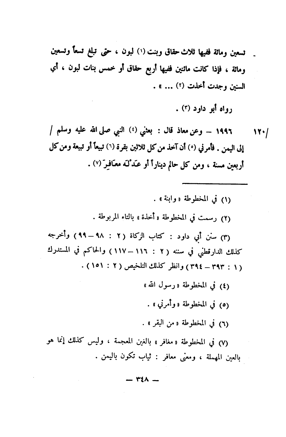 1996- وعن معاذ قال: "بعثني 4 النبي صلى الله عليه وسلم إلى اليمن. فأمرني 5 أن آخذ من كل ثلاثين بقرة 6 تبيعاً أو تبيعة، ومن كل أربعين مسنة، ومن كل حالم ديناراً أو عدله معافر" 7.