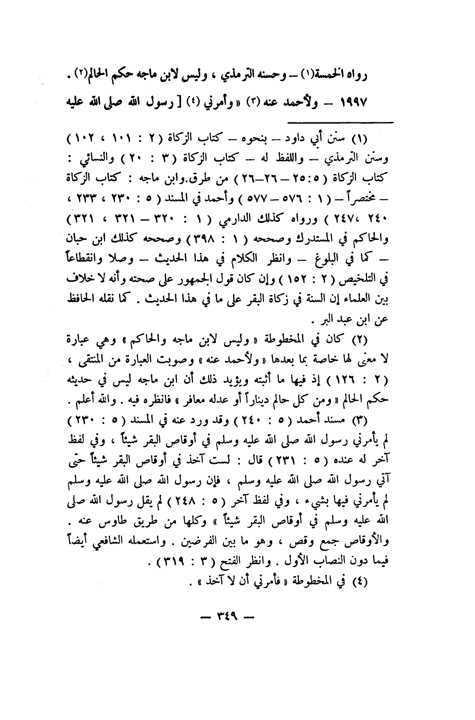 1 سنن أبي داود بنحوه، كتاب الزكاة (2/101, 102) ، وسنن الترمذي واللفظ له، كتاب الزكاة (3/20) ، والنسائي: كتاب الزكاة (5/25، 26) من طرق، وابن ماجة: كتاب الزكاة مختصراً (1/576، 577) ، وأحمد في المسند (5/230, 233, 240, 247) ، ورواه كذلك الدارمي (1/320، 321, 321) ، والحاكم في المستدرك وصححه (1/398) ، وصححه كذلك ابن حبان، كما في البلوغ، وانظر: الكلام في هذا الحديث، وصلاً وانقطاعاً في التلخيص (2/152) ، وإن كان قول الجمهور على صحته وأنه لا خلاف بين العلماء أن السنة في زكاة البقر على ما في هذا الحديث، كما نقله الحافظ عن ابن عبد البر.