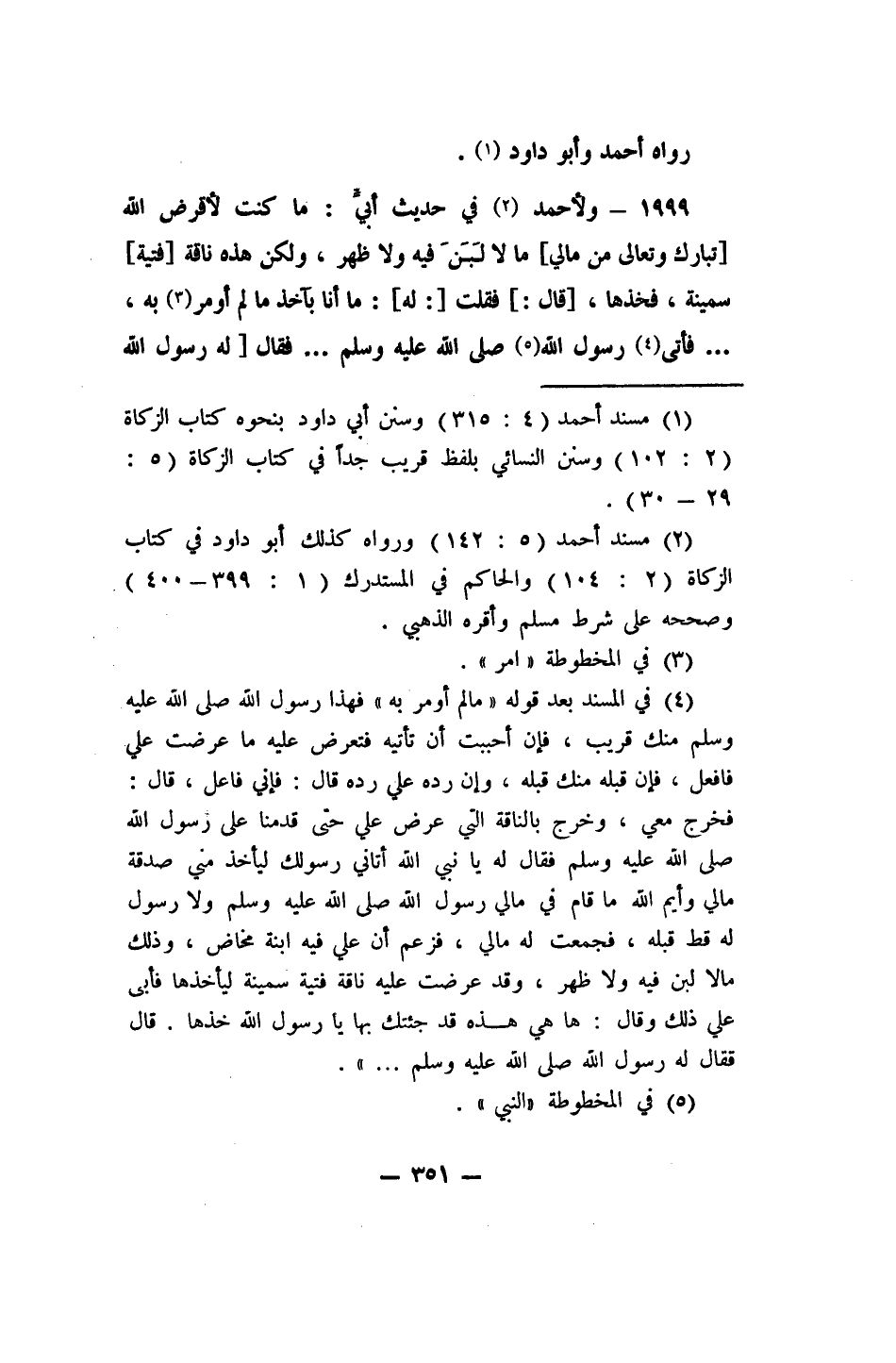 1999- ولأحمد 2 في حديث أبيٍّ: "ما كنت لأقرض الله [تبارك وتعالى من مالي] ما لا لَبَنَ فيه ولا ظهر، ولكن هذه ناقة [فتية] سمينة، فخذها. [قال:] فقلت [له] : ما أنا بآخذ ما لم أومر 3 به، ... فأتى 4 رسول الله 5 صلى الله عليه وسلم ... فقال [له رسول الله