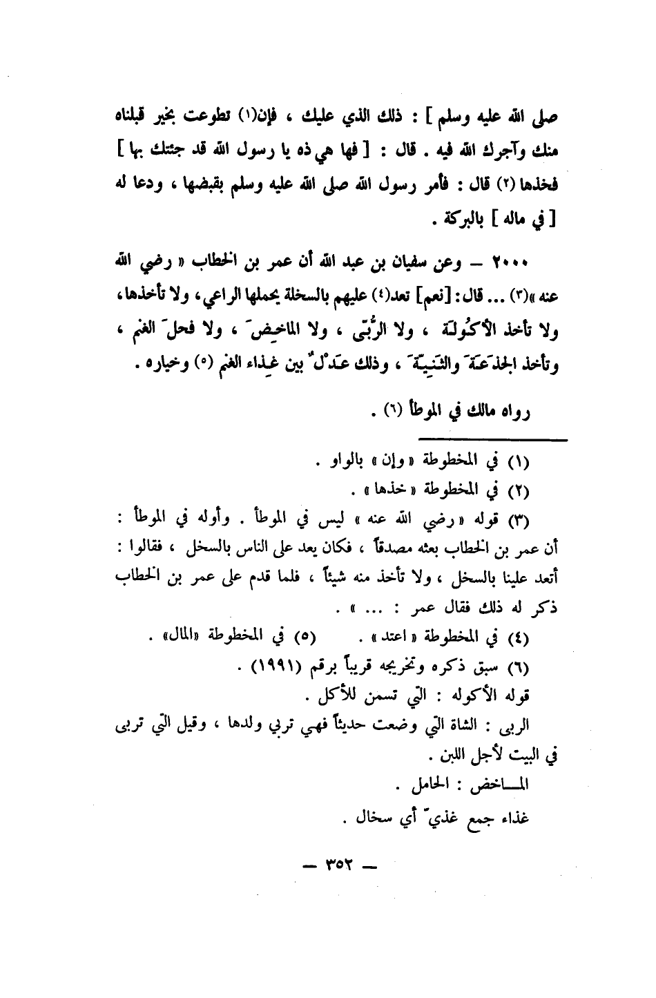 2000- وعن سفيان بن عبد الله أن عمر بن الخطاب، رضي الله عنه 3 قال: " [نعم] ، تعد 4 عليهم بالسخلة يحملها الراعي، ولا تأخذها، ولا تأخذ الأكُولَة، ولا الرُّبّى، ولا الماخِضَ، ولا فحلَ الغنم. وتأخذ الجذَعَةَ والثَنِيّةَ، وذلك عَدْلٌ بين غِذاء الغنم 5 وخياره". رواه مالك في الموطأ 6.