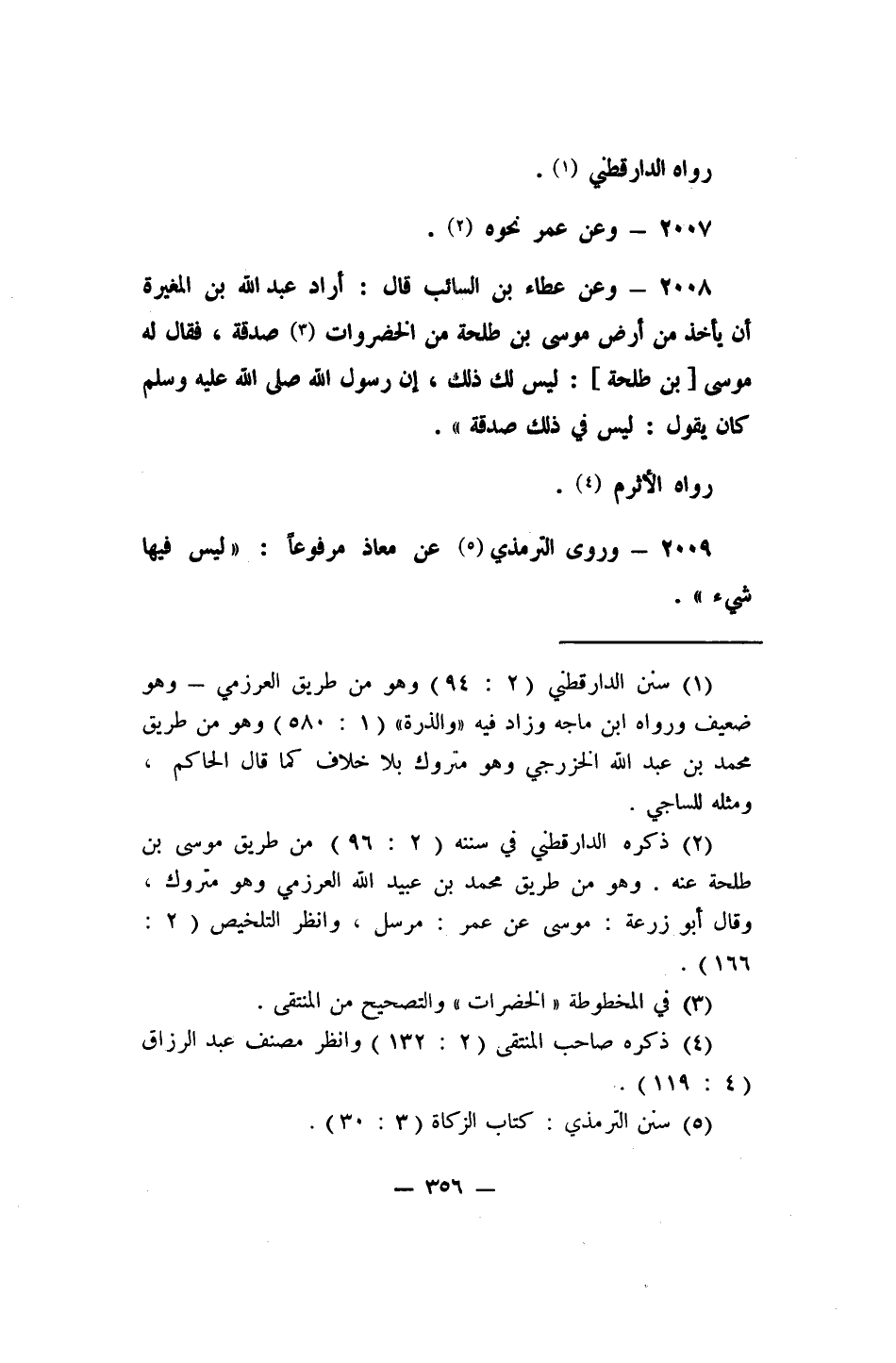 2008- وعن عطاء بن السائب قال: "أراد عبد الله بن المغيرة أن يأخذ من أرض موسى بن طلحة من الخضروات 3 صدقة، فقال له موسى [بن طلحة] : ليس لك ذلك، أن رسول الله صلى الله عليه وسلم كان يقول: ليس في ذلك صدقة". رواه الأثرم 4.