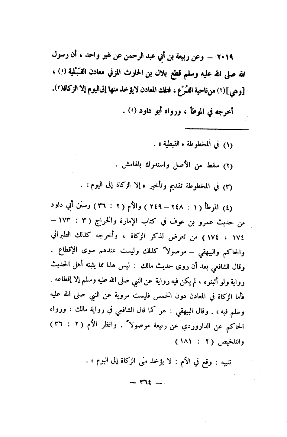 4 الموطأ (1/248، 249) ، والأم (2/36) ، وسنن أبي داود من حديث عمرو بن عوف في كتاب الإمارة والخراج (3/173، 174) من تعرض لذكر الزكاة, وأخرجه كذلك الطبراني والحاكم والبيهقي، موصولاً كذلك، وليست عندهم سوى الإقطاع. وقال الشافعي بعد أن روى حديث مالك: ليس هذا مما يثبته أهل الحديث رواية ولو أثبتوه, لم يكن فيه رواية عن النبي ? إلا إقطاعه. فأما الزكاة في المعادن دون الخمس، فليست مروية عن النبي ? فيه. وقال البيهقي: هو كما قال الشافعي في رواية مالك, ورواه الحاكم عن الداروردي عن ربيعة موصولاً. وانظر: الأم (2/36) ، والتلخيص (2/181) . تنبيه: وقع في الأم: لا يؤخذ مني الزكاة إلى اليوم.