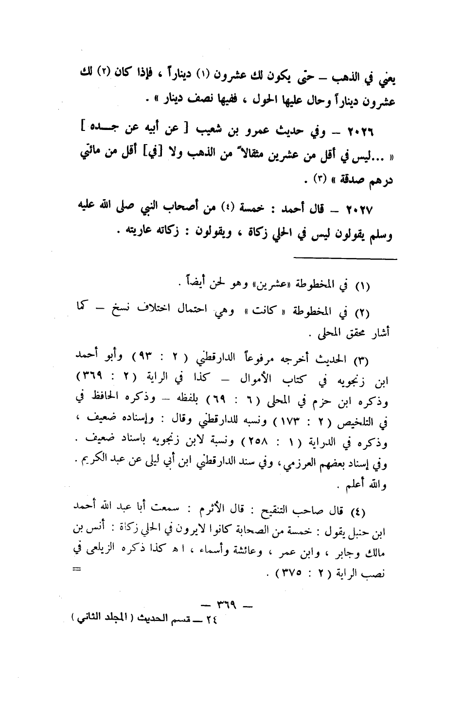 2026- وفي حديث عمرو بن شعيب [عن أبيه عن جده] : " ... ليس في أقل من عشرين مثقالاً من الذهب، ولا [في] أقل من مائتي درهم، صدقة" 3.