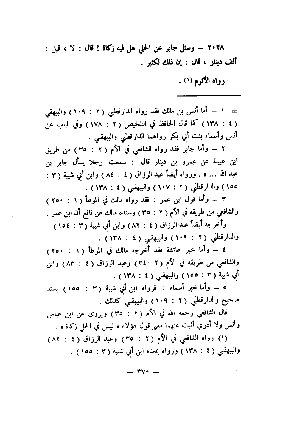 2028- "وسئل جابر عن الحلي، هل فيه زكاة؟ قال: لا. قيل: ألف دينار. قال: إن ذلك لكثير". رواه الأثرم 1.