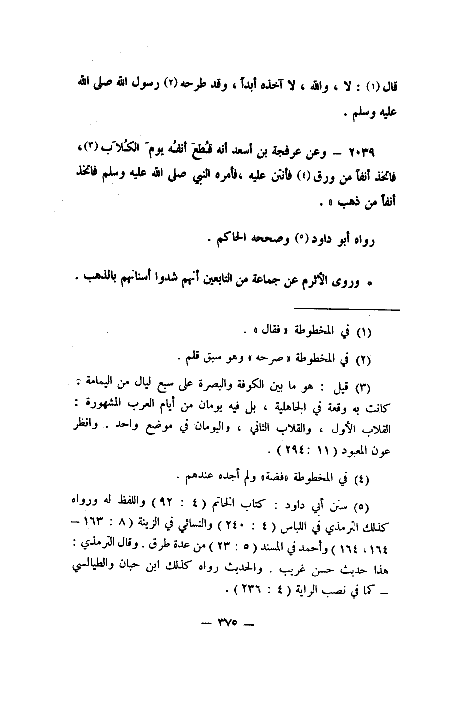 2039- وعن عرفجة بن أسعد: "أنه قُطع أنفُه يومَ الكُلاَب، 3 فاتخذ أنفاً من ورق 4 فأنتن عليه، فأمره النبي صلى الله عليه وسلم فاتخذ أنفاً من ذهب". رواه أبو داود، 5 وصححه الحاكم.