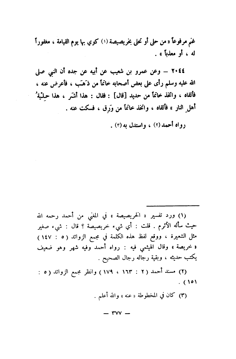 غنم، مرفوعاً: "مَن حلى أو تحلى بخريصيصة، 1 كُوي بها يوم القيامة، مغفوراً له، أو معذباً".