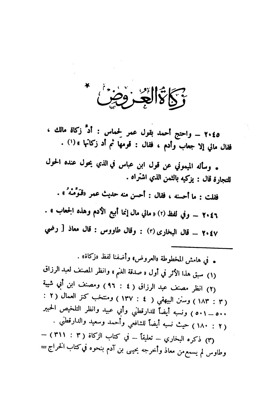 2045- واحتج أحمد بقول عمر لحِماس: "أد زكاة مالك! فقال: ما لي إلا جعاب وأدم. فقال: قَوِّمْها ثم أد زكاتها" 2.