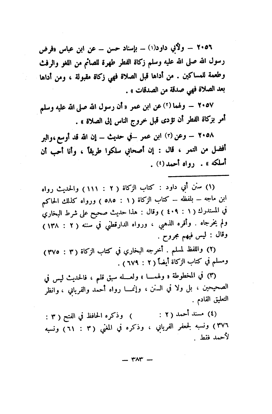 2056- ولأبي داود 1 - بإسناد حسن - عن ابن عباس: "فرض رسول الله صلى الله عليه وسلم زكاة الفطر: طهرة للصائم من اللغو والرفث، وطعمة للمساكين. من أداها قبل الصلاة فهي زكاة مقبولة، ومن أداها بعد الصلاة فهي صدقة من الصدقات".