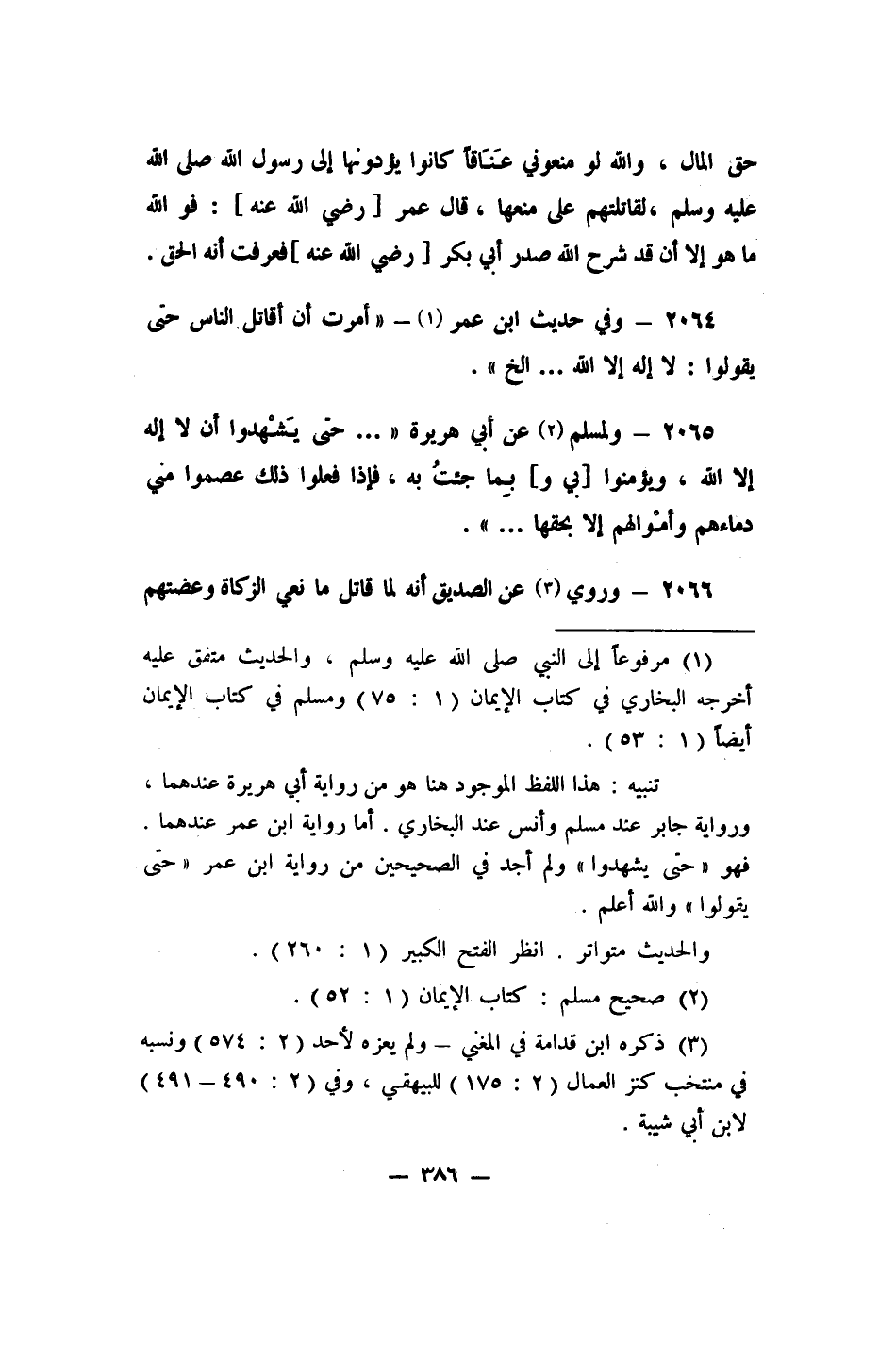 2065- ولمسلم 2 عن أبي هريرة: ".. . حتى يَشْهدوا أن لا إله إلا الله، ويؤمنوا [بي و] بِما جئتُ به؛ فإذا فعلوا ذلك عصموا مني دماءهم وأمْوالهم إلا بحقها".