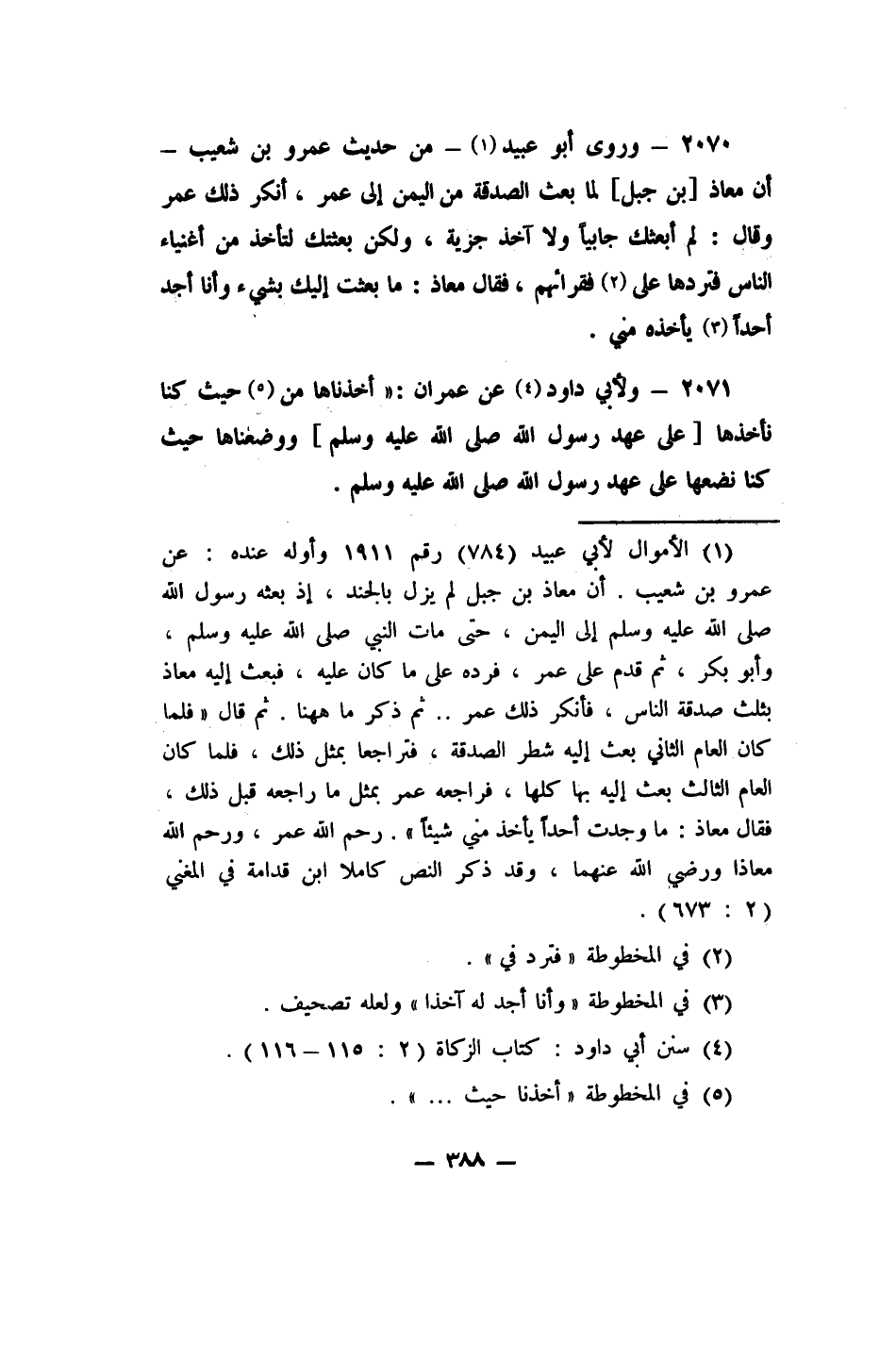 1 الأموال لأبي عبيد (784) رقم (1911) ، وأوله عنده: عن عمرو بن شعيب: "أن معاذ بن جبل لم يزل بالجند, إذ بعثه رسول الله ? إلى اليمن, حتى مات النبي ?, وأبو بكر. ثم قدم على عمر, فرده على ما كان عليه. فبعث إليه معاذ بثلث صدقة الناس, فأنكر ذلك عمر ... ثم ذكر ما ههنا. ثم قال: فلما كان العام الثاني، بعث إليه شطر الصدقة, فتراجعا بمثل ذلك. فلما كان العام الثالث، بعث إليه بها كلها, فراجعه عمر بمثل ما راجعه قبل ذلك, فقال معاذ: ما وجدت أحداً يأخذ مني شيئاً". رحم الله عمر, ورحم الله معاذاً، ورضي الله عنهما, وقد ذكر النص كاملاً ابن قدامة في المغني (2/673) .