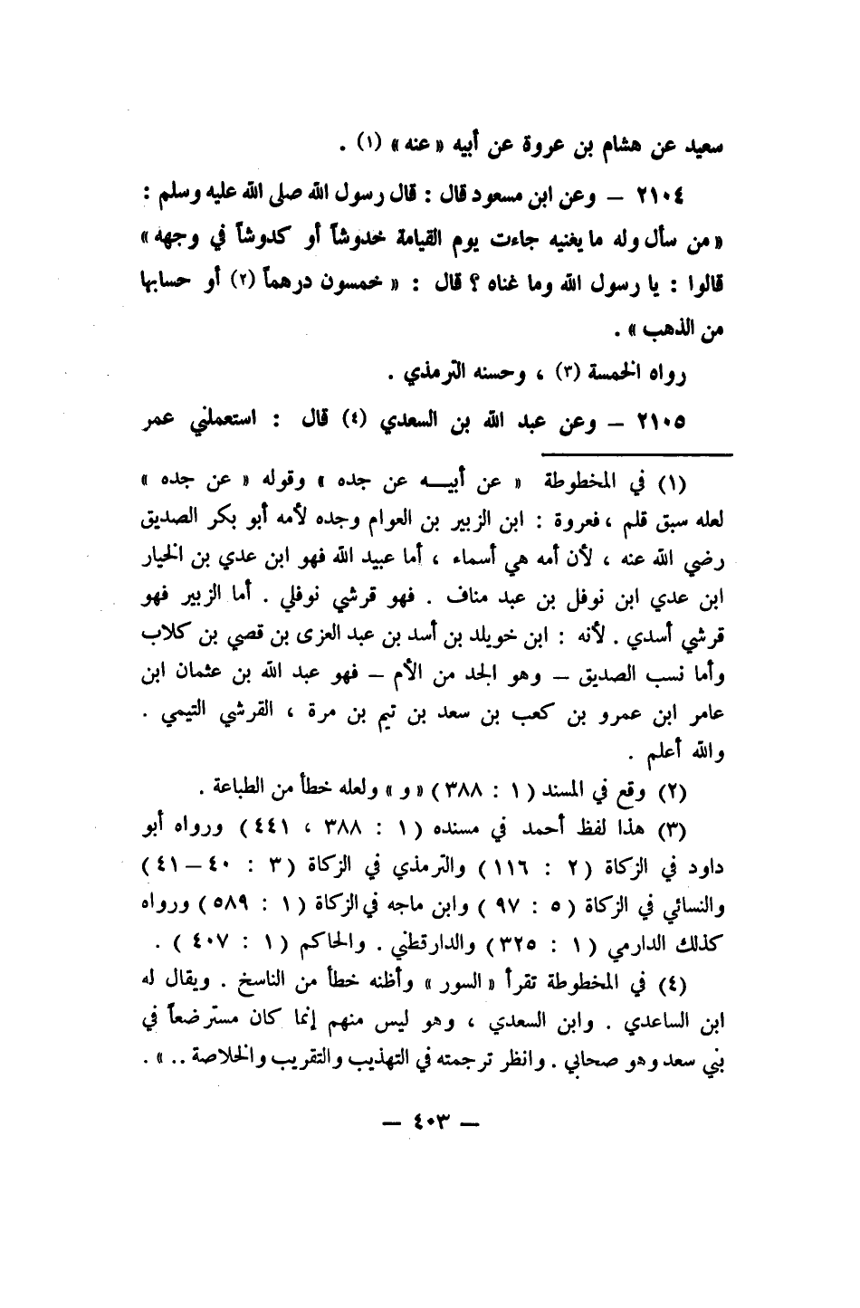2104- وعن ابن مسعود قال: قال رسول الله صلى الله عليه وسلم: "من سأل وله ما يغنيه جاءت يوم القيامة خدوشاً أو كدوشاً في وجهه. قالوا: يا رسول الله، وما غناه؟ قال: خمسون درهماً أو حسابها من الذهب" 2. رواه الخمسة، 3 وحسنه الترمذي.