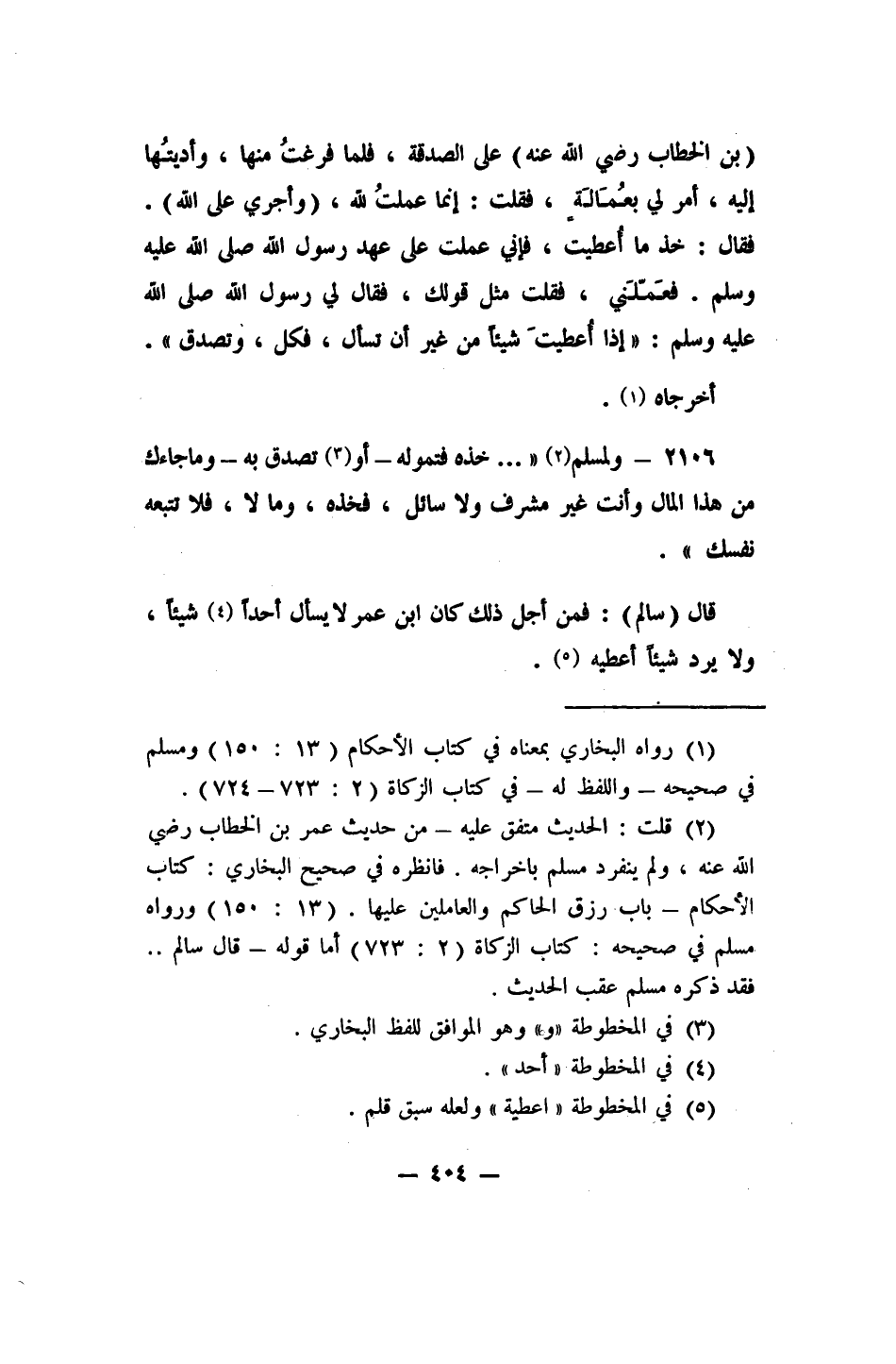 2106- ولمسلم: 2 "خذه فتموله، أو تصدقْ به. 3 وما جاءك من هذا المال وأنت غير مشرف ولا سائل فخُذْه، وما لا فلا تتبعه نفسك". قال (سالم) : فمن أجل ذلك "كان ابن عمر لا يسأل أحداً شيئاً، 4 ولا يردّ شيئاً أُعطِيَه" 5.