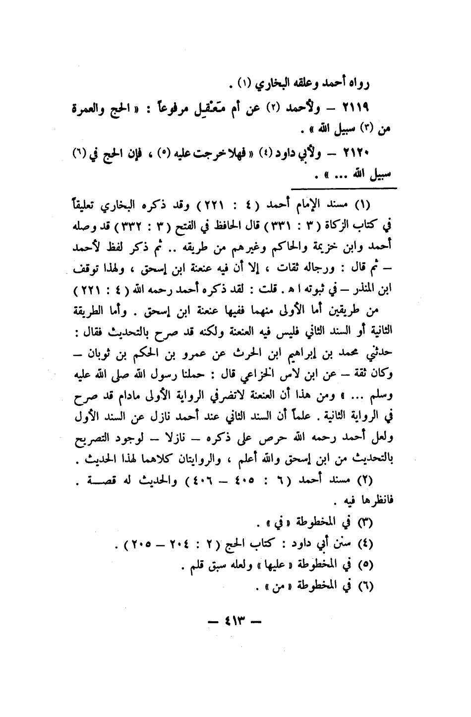 1 مسند الإمام أحمد (4/221) ، وقد ذكره البخاري تعليقاً في كتاب الزكاة (3/331) ، قال الحافظ في الفتح (3/332) : قد وصله أحمد وابن خزيمة والحاكم وغيرهم من طريقه ... ثم ذكر لفظ أحمد، ثم قال: ورجاله ثقات, إلا أن فيه عنعنة ابن إسحاق, ولهذا توقف ابن المنذر في ثبوته. اهـ. قلت: لقد ذكره أحمد، رحمه الله (4/221) من طريقين: أما الأولى منهما ففيها عنعنة ابن إسحاق. وأما الطريقة الثانية أو السند الثاني، فليس فيه العنعنة، ولكنه قد صرح بالتحديث فقال: حدثني محمد بن إبراهيم بن الحرث عن عمرو بن الحكم بن ثوبان، وكان ثقة، عن ابن لاس الخزاعي قال: حملنا رسول الله ? ... ومن هذا أن العنعنة لا تضر في الرواية الأولى ما دام قد صرح في الرواية الثانية، علماً أن السند الثاني عند أحمد نازل عن السند الأول، ولعل أحمد، رحمه الله، حرص على ذكره نازلاً لوجود التصريح بالتحديث من ابن إسحاق. والله أعلم. والروايتان كلاهما لهذا الحديث.
