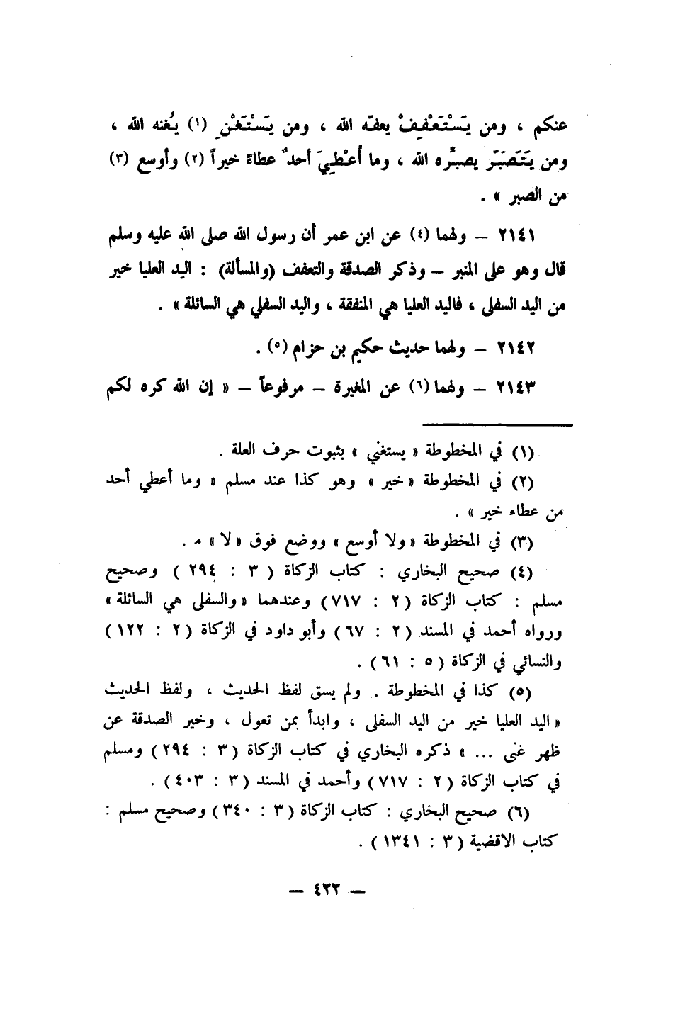 5 كذا في المخطوطة، ولم يسق لفظ الحديث, ولفظ الحديث: "اليد العليا خير من اليد السفلى, وابدأ بمن تعول, وخير الصدقة عن ظهر غنى ... "، ذكره البخاري في كتاب الزكاة (3/294) ، ومسلم في كتاب الزكاة (2/717) ، وأحمد في المسند (3/403) .