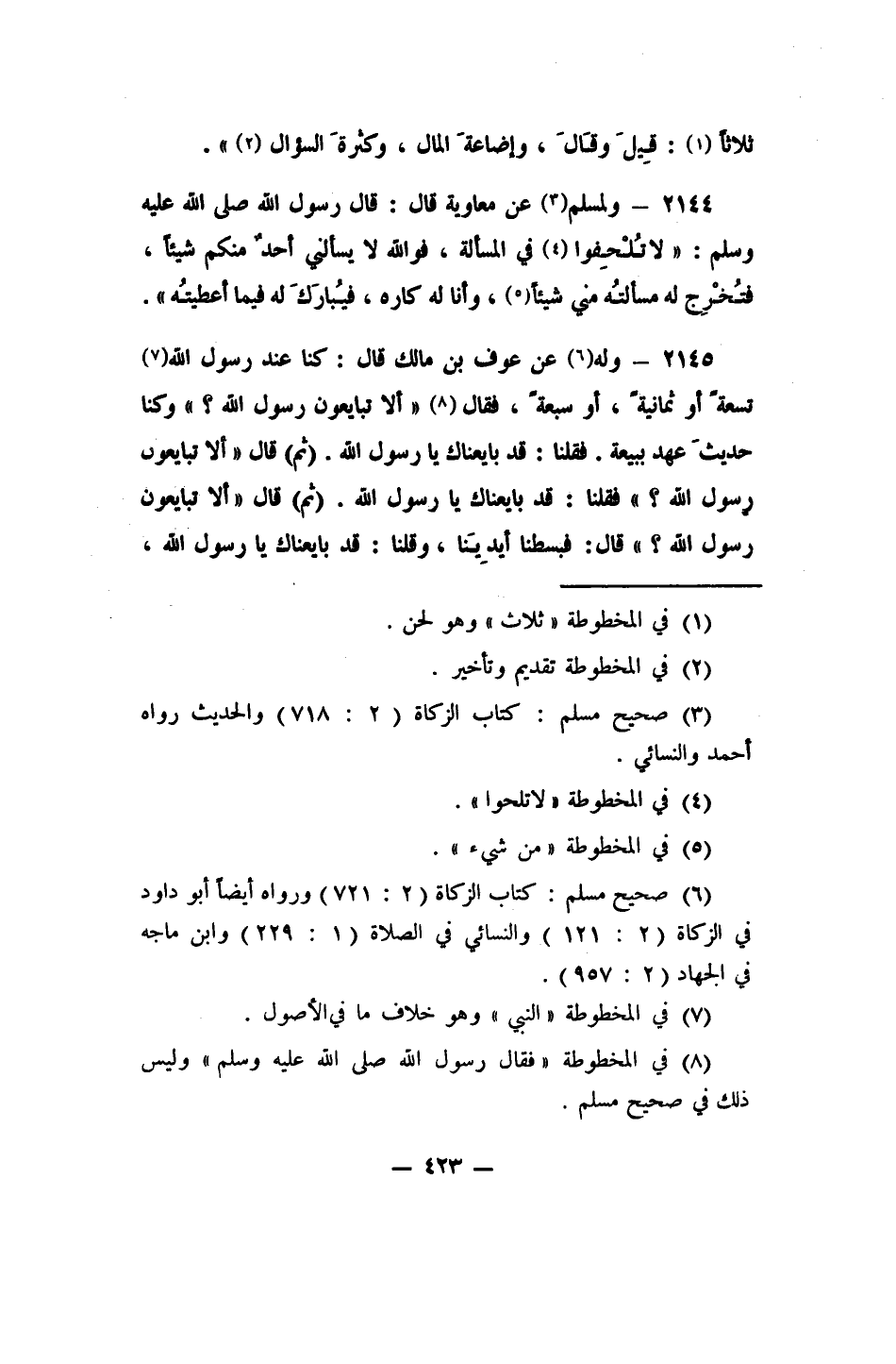 2144- ولمسلم 3 عن معاوية قال: قال رسول الله صلى الله عليه وسلم: "لا تُلْحِفوا 4 في المسألة؛ فوالله لا يسألني أحدٌ منكم شيئاً، فتُخْرِج له مسألتُه مني شيئاً، 5 وأنا له كاره، فيُبارَكَ له فيما أعطيتُه".