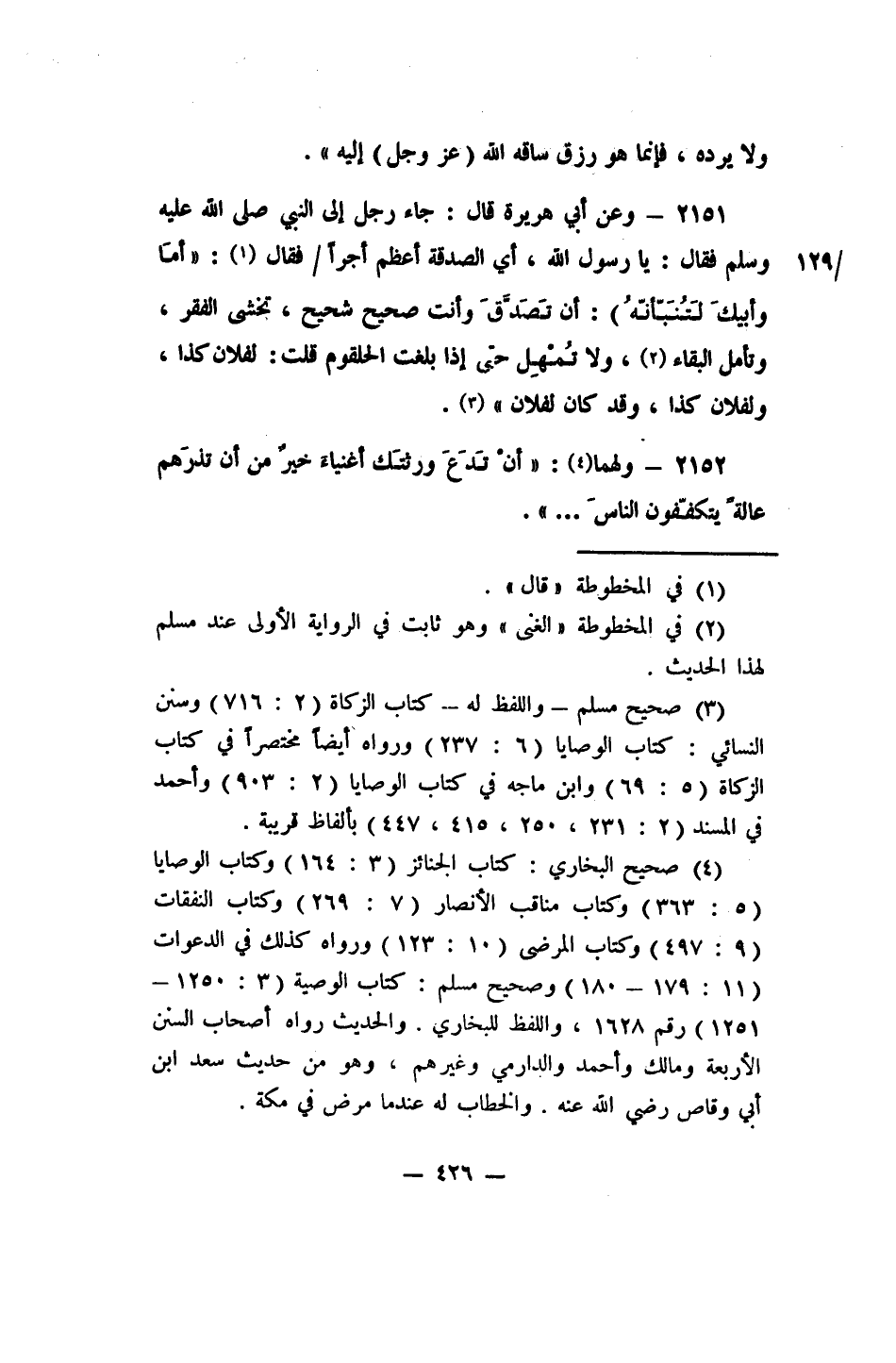 2152- 4 ولهما: "أنْ تَدَعَ ورثتَك أغنياءَ، خيرٌ من أن تذرَهم عالة يتكففون الناس ... ".