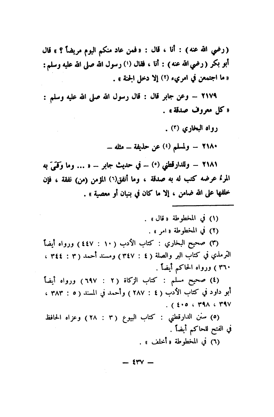 2181- وللدارقطني 5 - في حديث جابر -: "وما وَقَى به المرءُ عرضه كتب له به صدقة. وما أنفق 6 المؤمن (من) نفقة، فإن خلفها على الله ضامن، إلا ما كان في بنيان أو معصية".