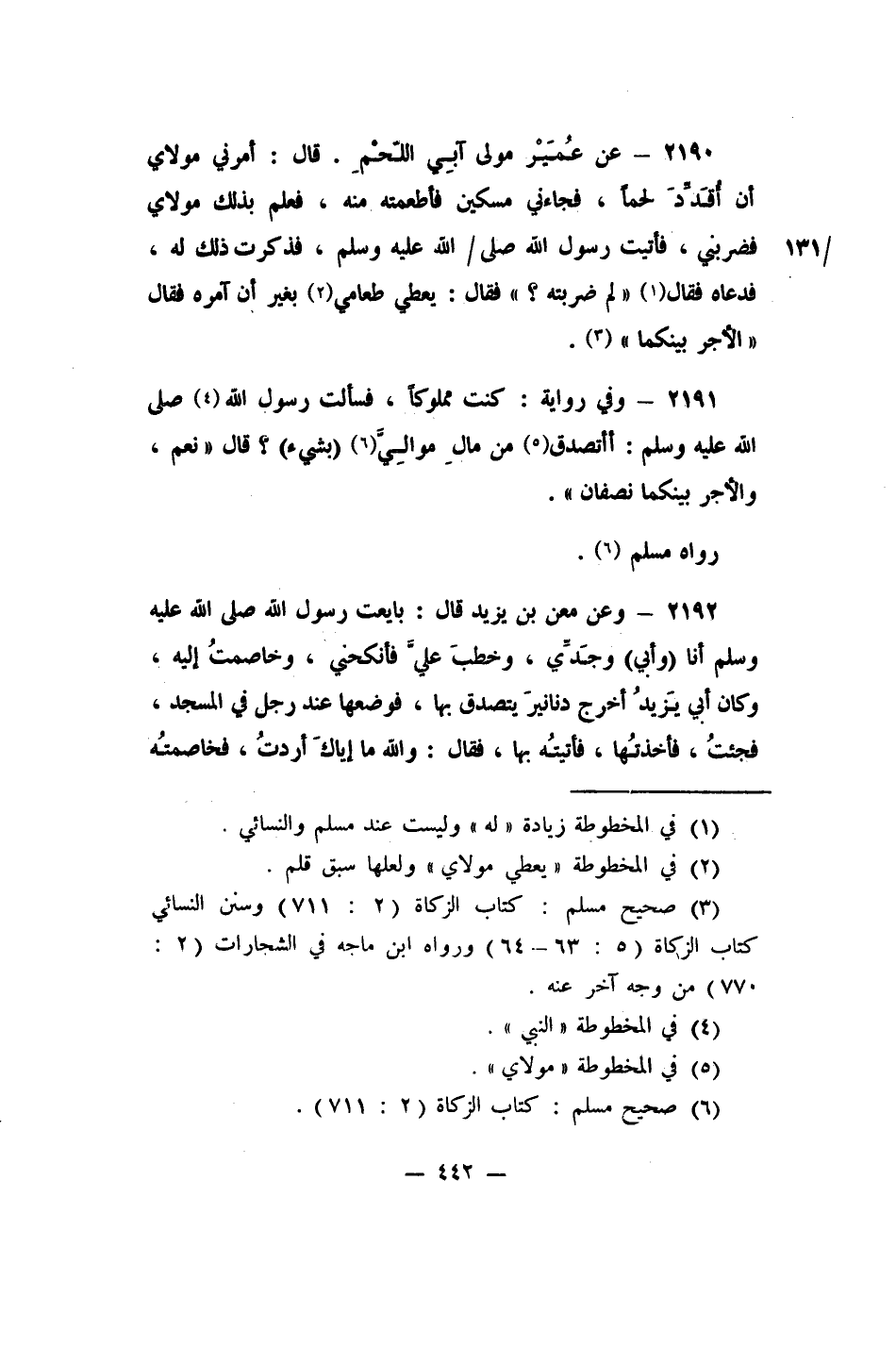 2191- وفي رواية: 4 "كنت مملوكاً، فسألت رسول الله صلى الله عليه وسلم: 5 أأتصدق من مال موالِيَّ 6 (بشيء) ؟ قال: نعم، والأجر بينكما نصفان". رواه مسلم 6.