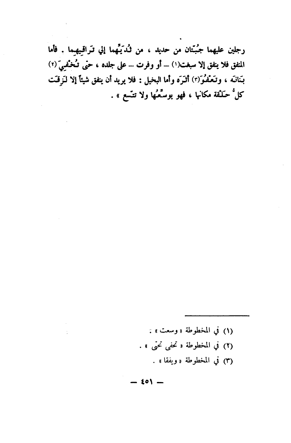 رجلين عليهما جُبّتان من حديد، من ثُدَيِّهما إلى تَراقِيهِما. فأما المنفق: فلا ينفق إلا سبغت 1 - أو وفرت - على جلده، حتى تُخْفِيَ 2 بَنانَه، وتَعْفُوَ 3 أثَرَه. وأما البخيل: فلا يريد أن ينفق شيئاً إلا لَزِقَت كلُّ حَلْقة مكانها، فهو يوسعها ولا تتسع".