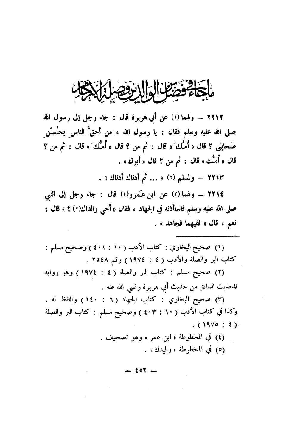 2212- ولهما 1 عن أبي هريرة قال: "جاء رجل إلى رسول الله صلى الله عليه وسلم فقال: يا رسول الله، من أحق الناسِ بِحُسْنِ صَحابتي؟ قال: أُمُّكَ. قال: ثم من؟ قال: أمك. قال: ثم من؟ قال: أُمُّك. قال: ثم من؟ قال: أبوك".