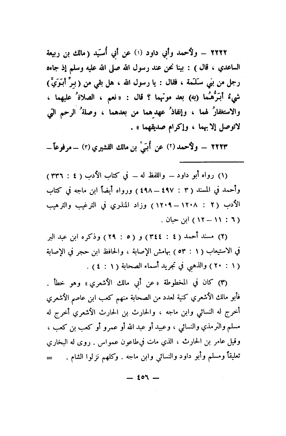 2222- ولأحمد وأبي داود 1 عن أبي أُسَيد (مالك بن ربيعة الساعدي، قال) : "بينا نحن عند رسول الله صلى الله عليه وسلم إذ جاءه رجل من بني سَلَمة، فقال: يا رسول الله، هل بقي من (بِرِّ أبَوَيَّ) شيءٌ أبِرُّهُما (به) بعد موتهما؟ قال: نعم، الصلاةُ عليهما، والاستغفارُ لهما، وإنفاذُ عهدِهما من بعدهما، وصلةُ الرحم التي لا توصَل إلا بهما، وإكرام صديقهما".