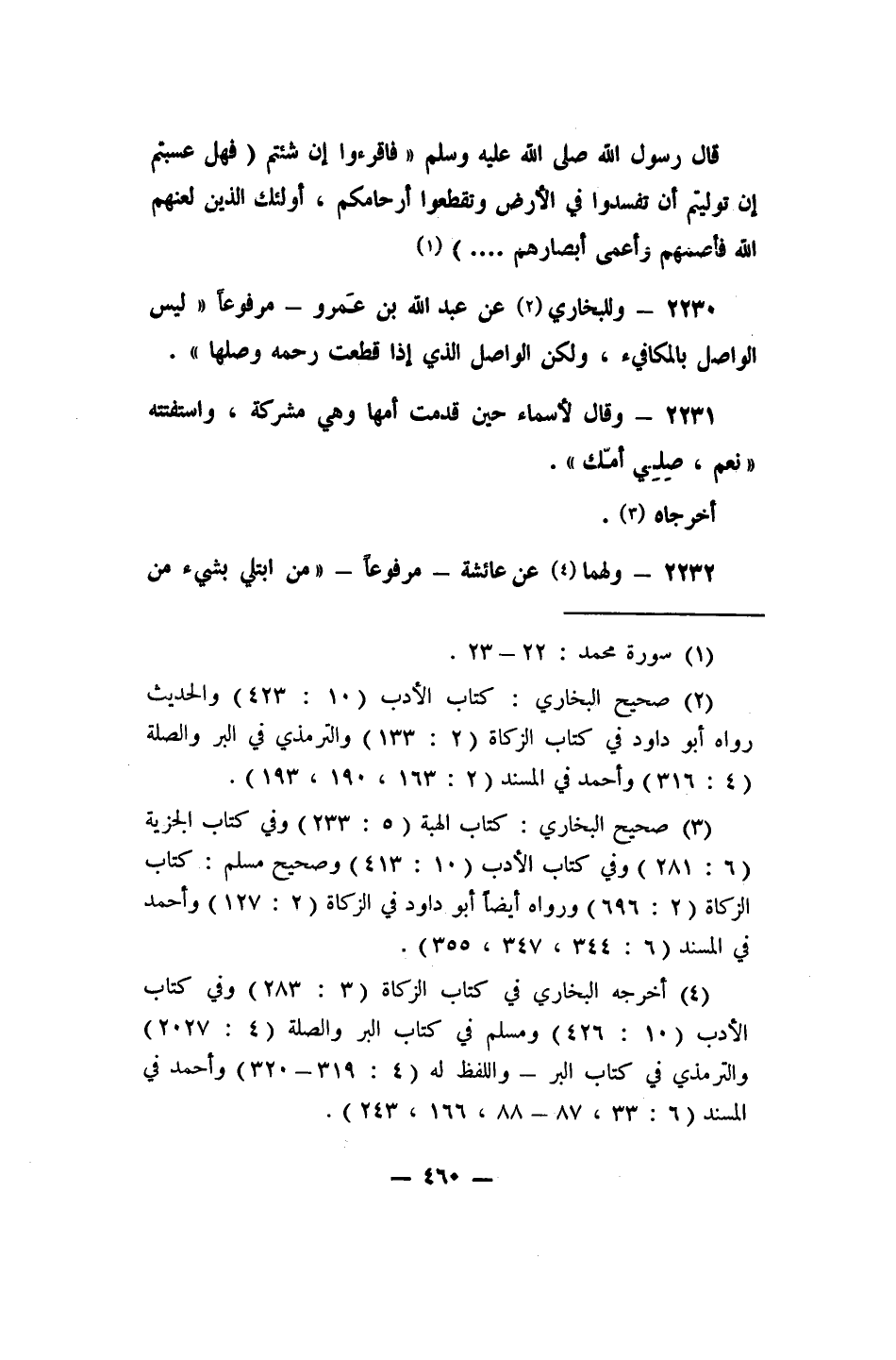 2230- وللبخاري 2 عن عبد الله بن عَمرو، مرفوعاً: "ليس الواصل بالمكافئ، ولكن الواصل الذي إذا قطعت رحمه وصلها".
