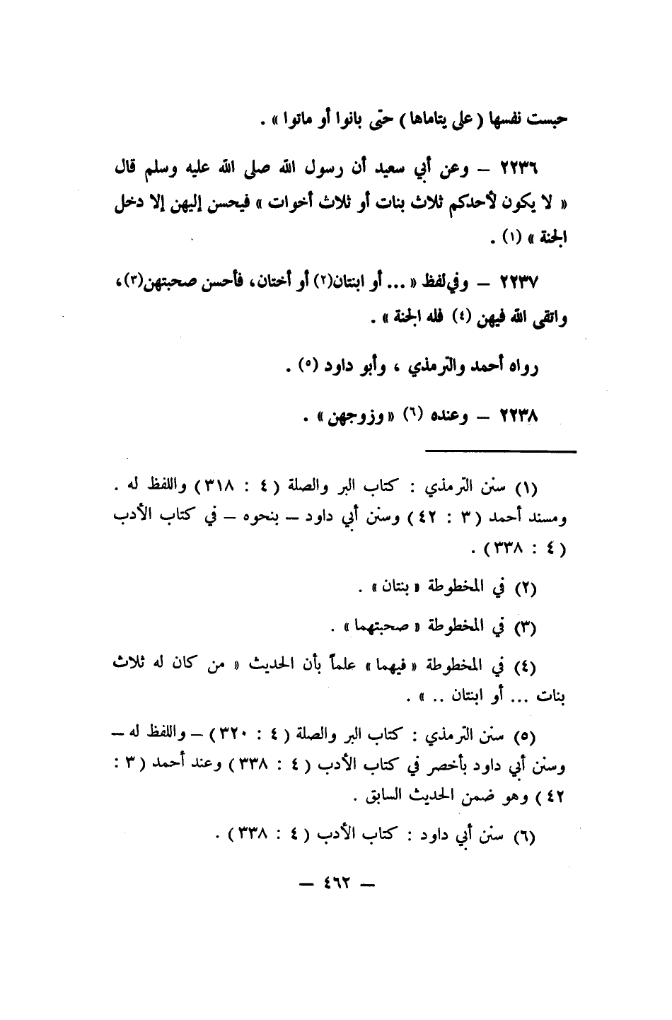 2237- وفي لفظ: " ... أو ابنتان 2 أو أختان، فأحسن صحبتهن، 3 واتقى الله فيهن، 4 فله الجنة". رواه أحمد والترمذي، وأبو داود 5.