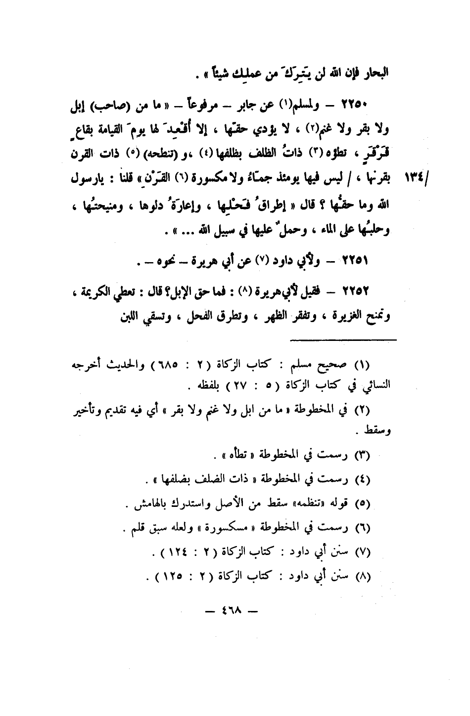 2250- ولمسلم 1 عن جابر، مرفوعاً: "ما من (صاحب) إبل ولا بقر ولا غنم، 2 لا يؤدي حقّها، إلا أُقْعِدَ لها يومَ القيامة بقاعٍ قَرْقَرٍ، تطؤه 3 ذاتُ الظلف بظلفها، 4 و (تنطحه) 5 ذات القرن بقرنها؛ ليس فيها يومئذ جمّاء ولا مكسورة 6 القَرْنِ. قلنا: يا رسول الله، وما حقها؟ قال: إطراق فحلها، وإعارة دلوها، ومنيحتُها، وحلبُها على الماء، وحملٌ عليها في سبيل الله ... ".