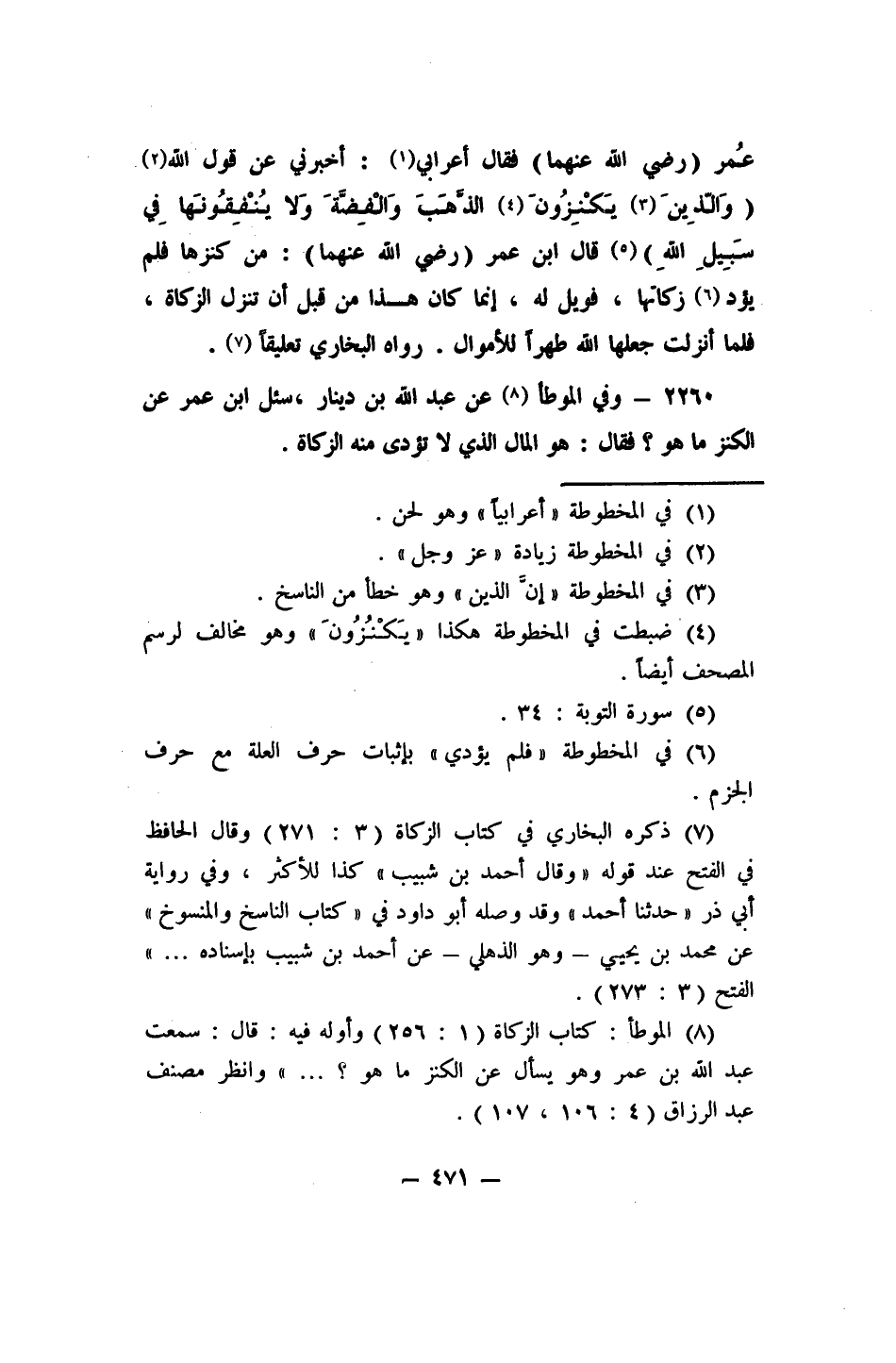2260- وفي الموطأ 6 عن عبد الله بن دينار: "سئل ابن عمر عن الكنز ما هو؟ فقال: هو المال الذي لا تؤدى منه الزكاة".