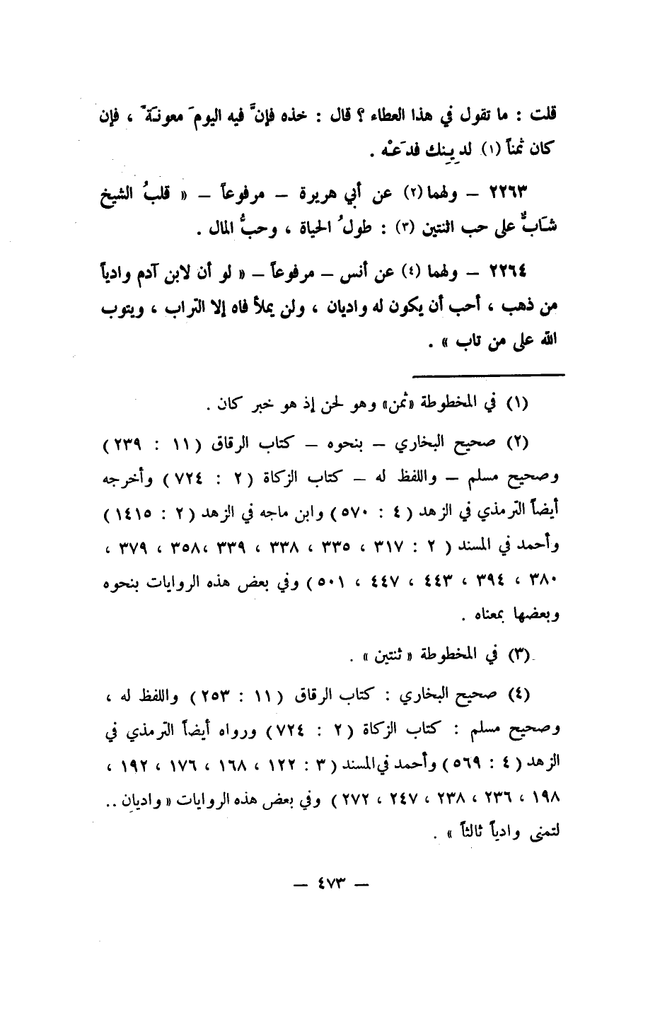 2263- ولهما 2 عن أبي هريرة، مرفوعاً: "قلبُ الشيخ شَابٌّ على حب اثنتين: 3 طولُ الحياة، وحبُّ المال".