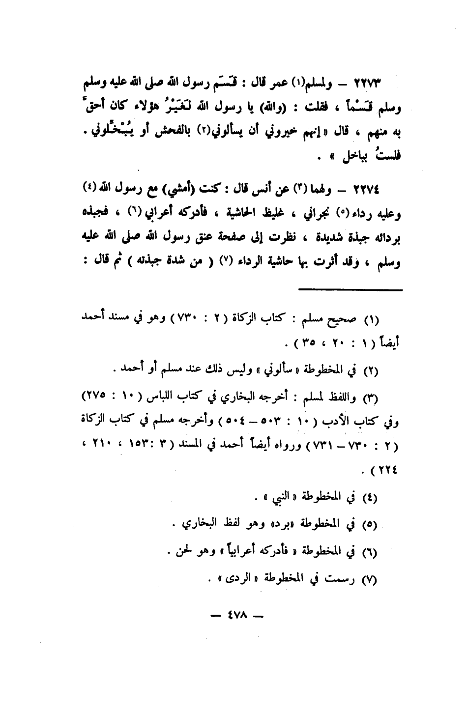 2274- ولهما 3 عن أنس قال: "كنت (أمشي) مع رسول الله 4 وعليه رداء 5 نجراني، غليظ الحاشية، فأدركه أعرابي 6 فجبذه بردائه جبذة شديدة، نظرت إلى صفحة عنق رسول الله صلى الله عليه وسلم وقد أثرت بها حاشية الرداء 7 (من شدة جبذته) . ثم قال: