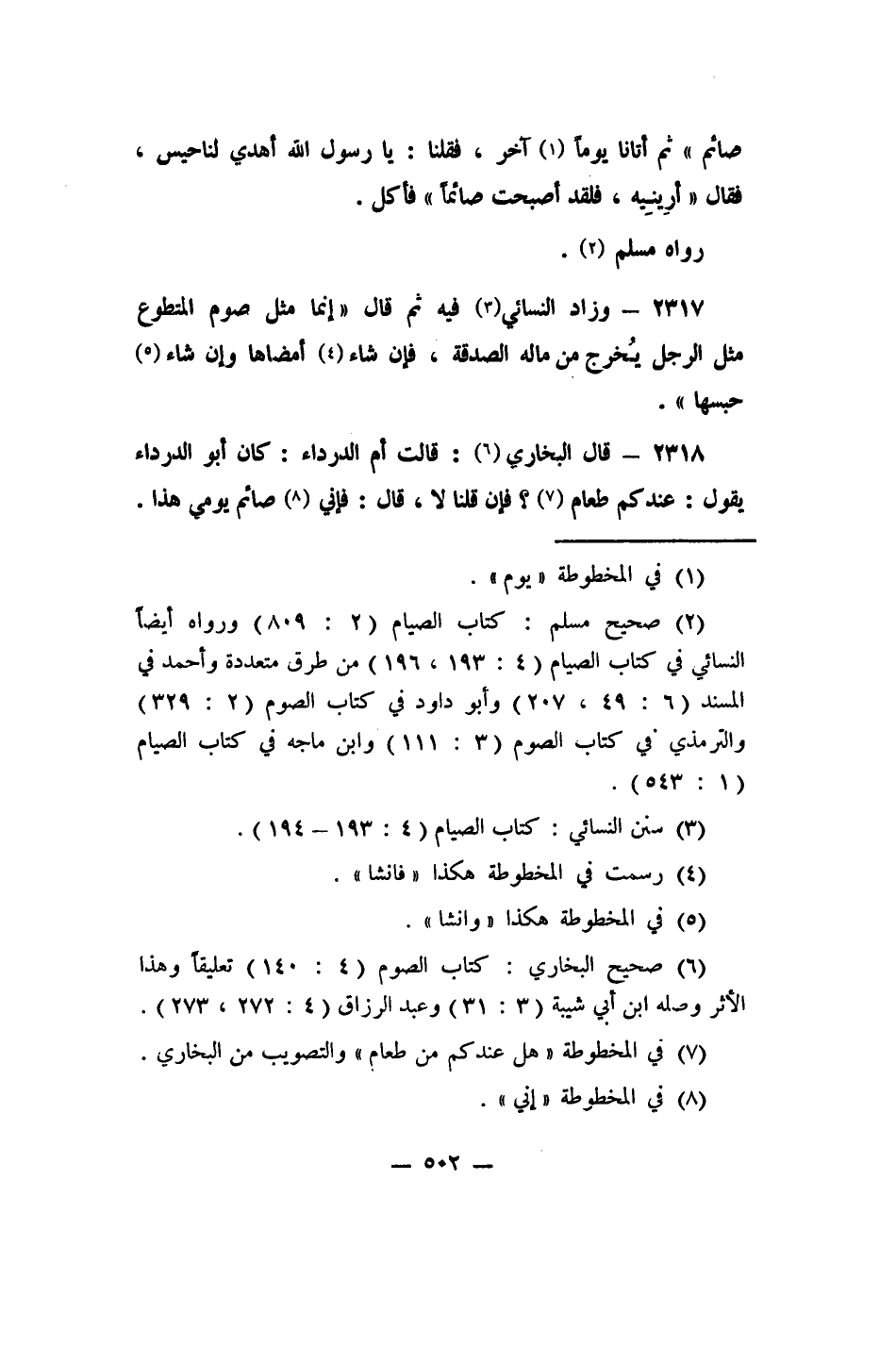 2318- قال البخاري: 6 قالت أم الدرداء: "كان أبو الدرداء يقول: عندكم طعام؟ 7 فإن قلنا: لا، قال: فإني 8 صائم يومي هذا".