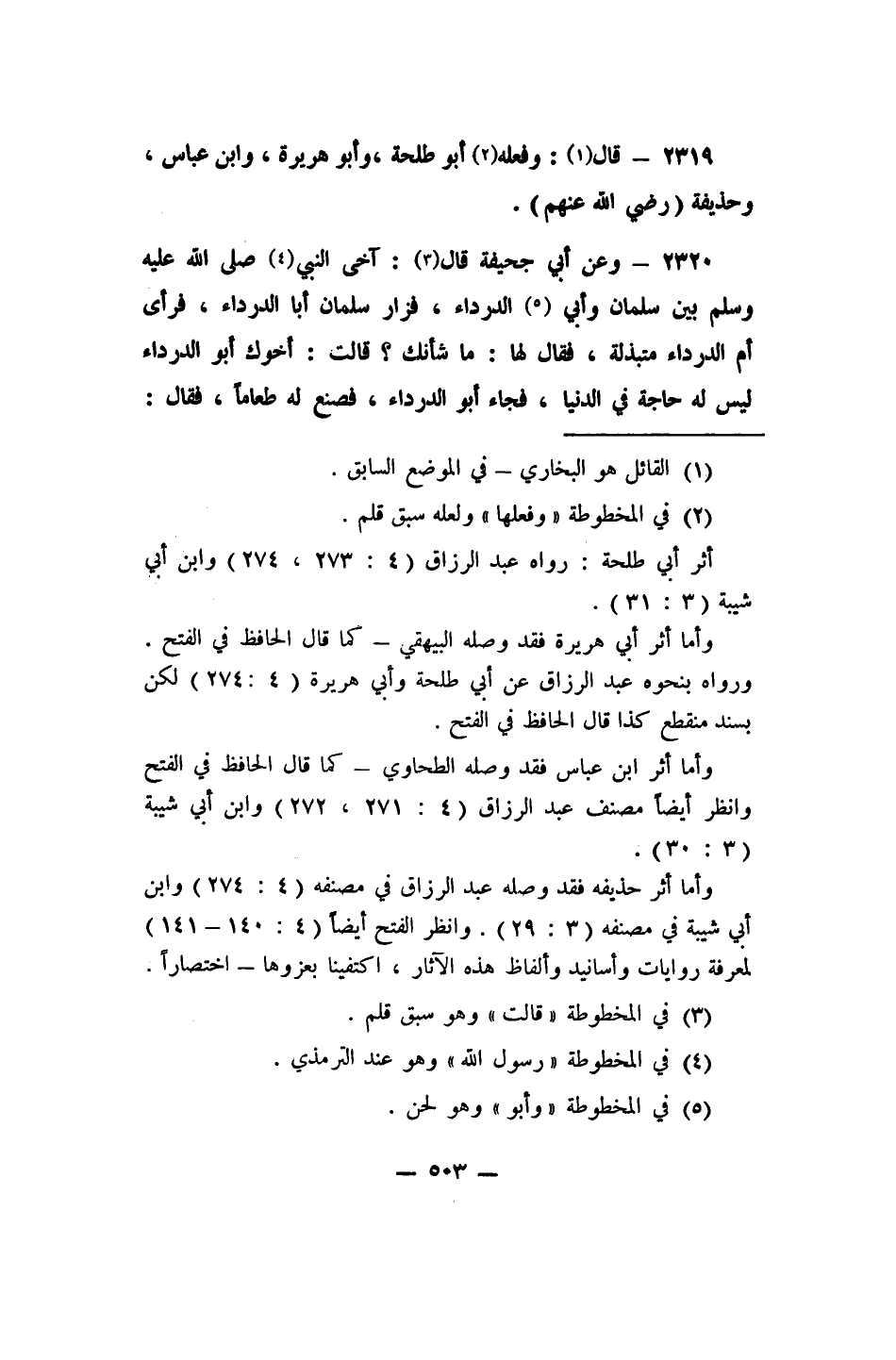 2 في المخطوطة: (وفعلها) ، ولعله سبق قلم. أثر أبي طلحة رواه عبد الرزاق (4/273, 274) ، وابن أبي شيبة (3/31) ، وأما أثر أبي هريرة، فقد وصله البيهقي، كما قال الحافظ في الفتح، ورواه بنحوه عبد الرزاق عن أبي طلحة وأبي هريرة (4/274) ، لكن بسند منقطع، كذا قال الحافظ في الفتح. وأما أثر ابن عباس، فقد وصله الطحاوي، كما قال الحافظ في الفتح، وانظر أيضاً: مصنف عبد الرزاق (4/271, 272) ، وابن أبي شيبة (3/30) . وأما أثر حذيفة فقد وصله عبد الرزاق في مصنفه (4/274) ، وابن أبي شيبة في مصنفه (3/29) . وانظر: الفتح أيضاً (4/140، 141) لمعرفة روايات وأسانيد وألفاظ هذه الآثار, اكتفينا بعزوها، اختصاراً.