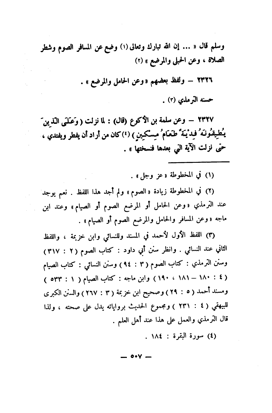 2326- ولفظ بعضهم: "وعن الحامل والمرضع". حسنه الترمذي 3.