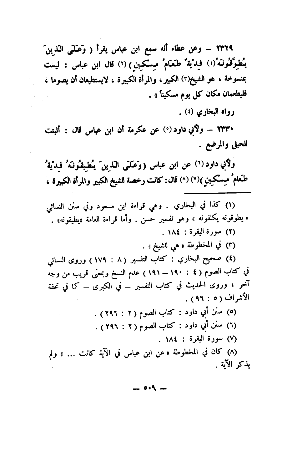 2329- وعن عطاء أنه سمع ابن عباس يقرأ: " {وَعَلَى الَّذِينَ يُطِيقُونَهُ فِدْيَةٌ طَعَامُ مِسْكِينٍ} قال ابن عباس: ليست بمنسوخة؛ هو الشيخ 1 الكبير، والمرأة الكبيرة، لا يستطيعان أن يصوما، فيطعمان مكان كل يوم مسكيناً". رواه البخاري 2.