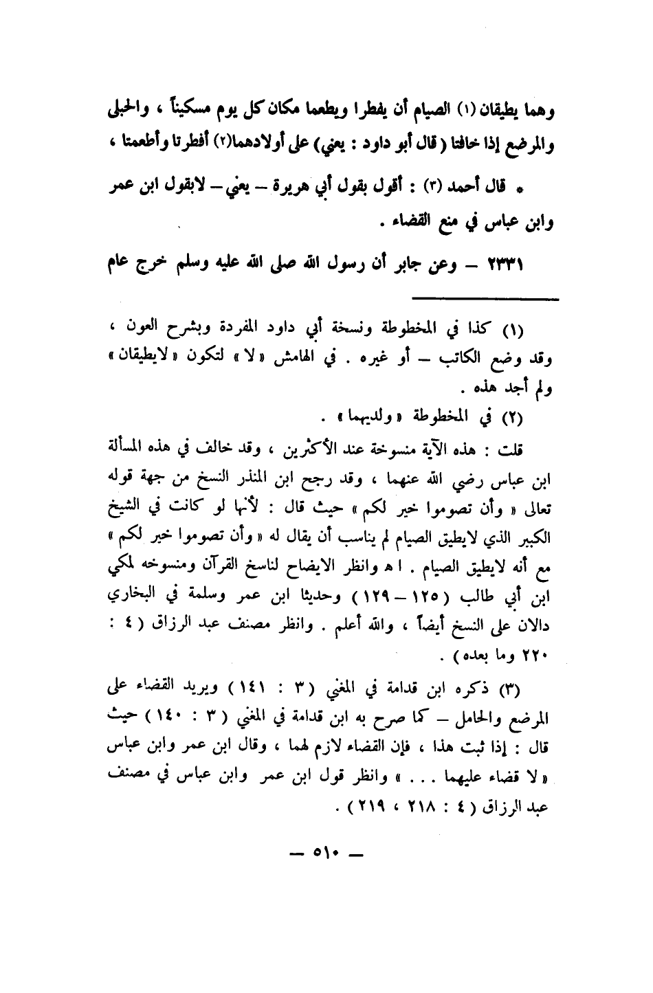 3 ذكره ابن قدامة في المغني (3/141) ، ويريد القضاء على المرضع والحامل، كما صرح به ابن قدامة في المغني (3/140) حيث قال: إذا ثبت هذا, فإن القضاء لازم لهما, وقال ابن عمر وابن عباس: لا قضاء عليهما ... وانظر: قول ابن عمر وابن عباس في مصنف عبد الرزاق (4/218, 219)