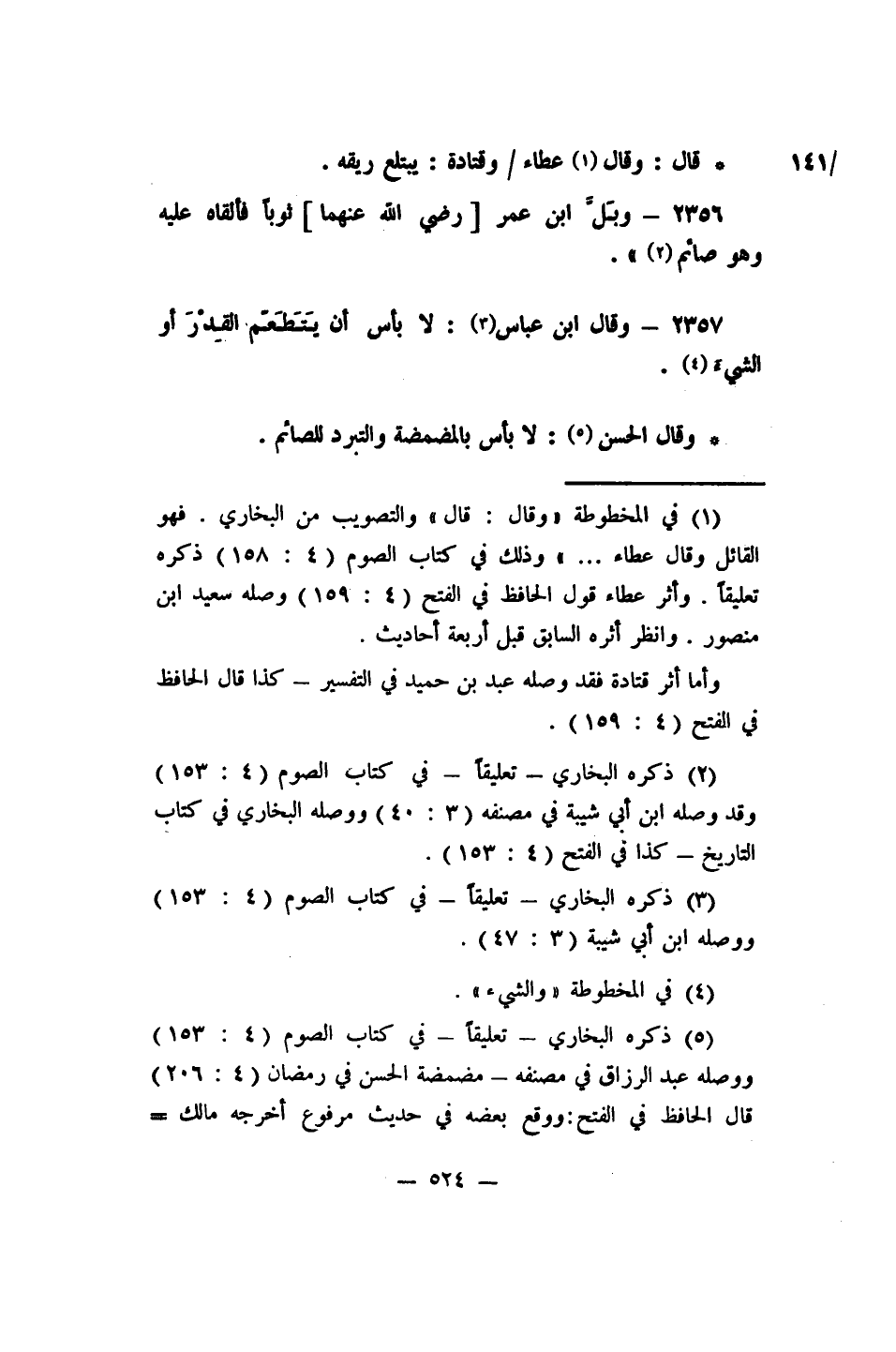 2356- "وبَلَّ ابن عمر [رضي الله عنهما] ثوباً فألقاه عليه وهو صائم" 2.