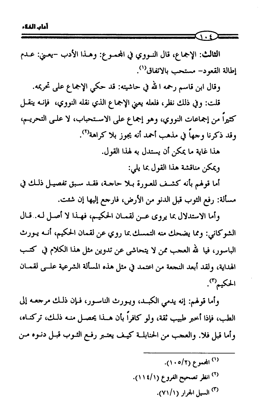 وأما الاستدلال بما يروى عن لقمان الحكيم، فهذا لا أصل له. قال الشوكاني: ومما يضحك منه التمسك بما روي عن لقمان الحكيم، أنه يورث الباسور، فيا لله العجب ممن لا يتحاشى عن تدوين مثل هذا الكلام في كتب الهداية، ولقد أبعد النجعة من اعتمد في مثل هذه المسألة الشرعية على لقمان الحكيم (¬٣).