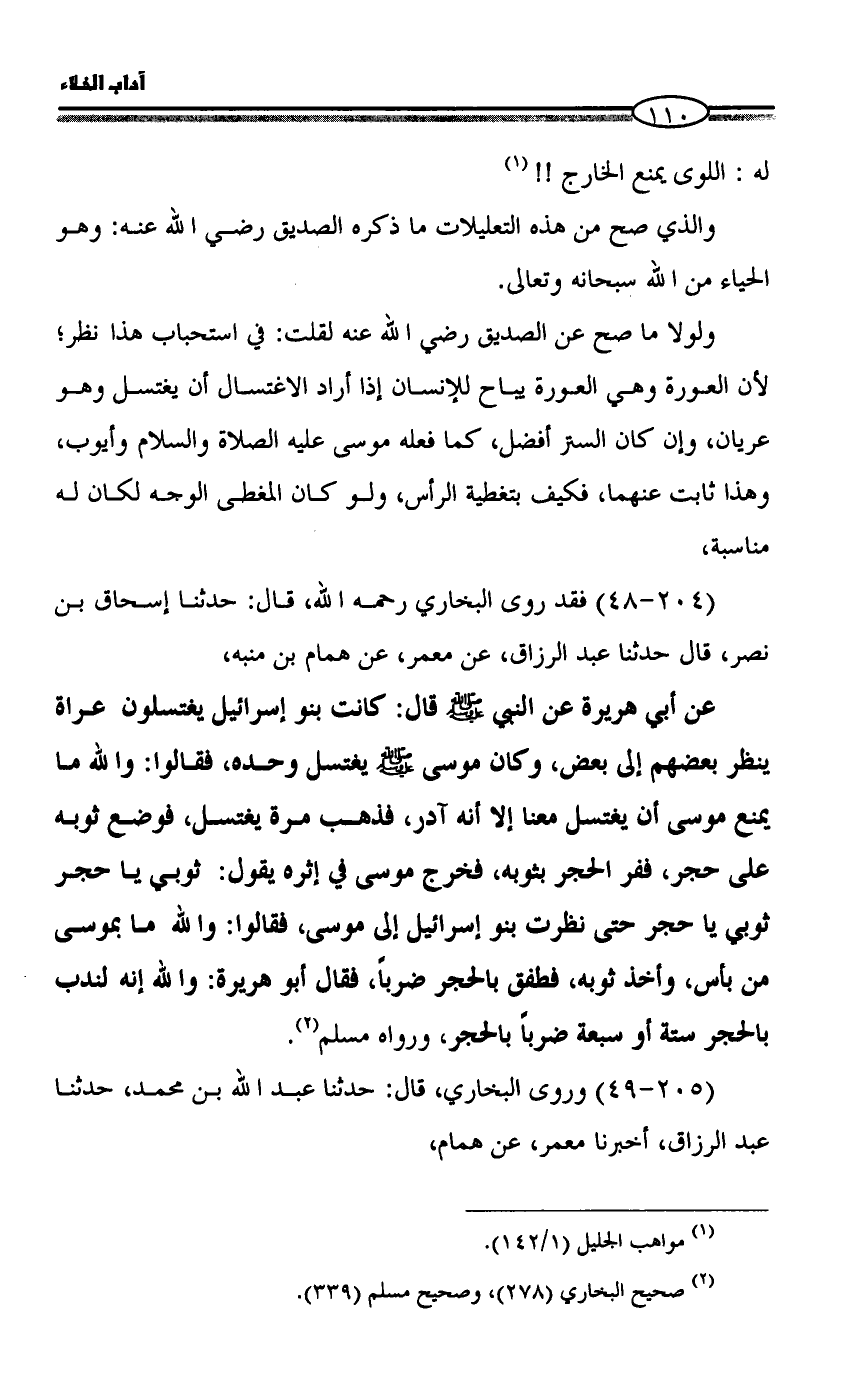 عن أبي هريرة عن النبي - صلى الله عليه وسلم - قال: كانت بنو إسرائيل يغتسلون عراة ينظر بعضهم إلى بعض، وكان موسى - صلى الله عليه وسلم - يغتسل وحده، فقالوا: والله ما يمنع موسى أن يغتسل معنا إلا أنه آدر، فذهب مرة يغتسل، فوضع ثوبه على حجر، ففر الحجر بثوبه، فخرج موسى في إثره يقول: ثوبي يا حجر ثوبي يا حجر حتى نظرت بنو إسرائيل إلى موسى، فقالوا: والله ما بموسى من بأس، وأخذ ثوبه، فطفق بالحجر ضرباً، فقال أبو هريرة: والله إنه لندب بالحجر ستة أو سبعة ضرباً بالحجر، ورواه مسلم (¬٢).
