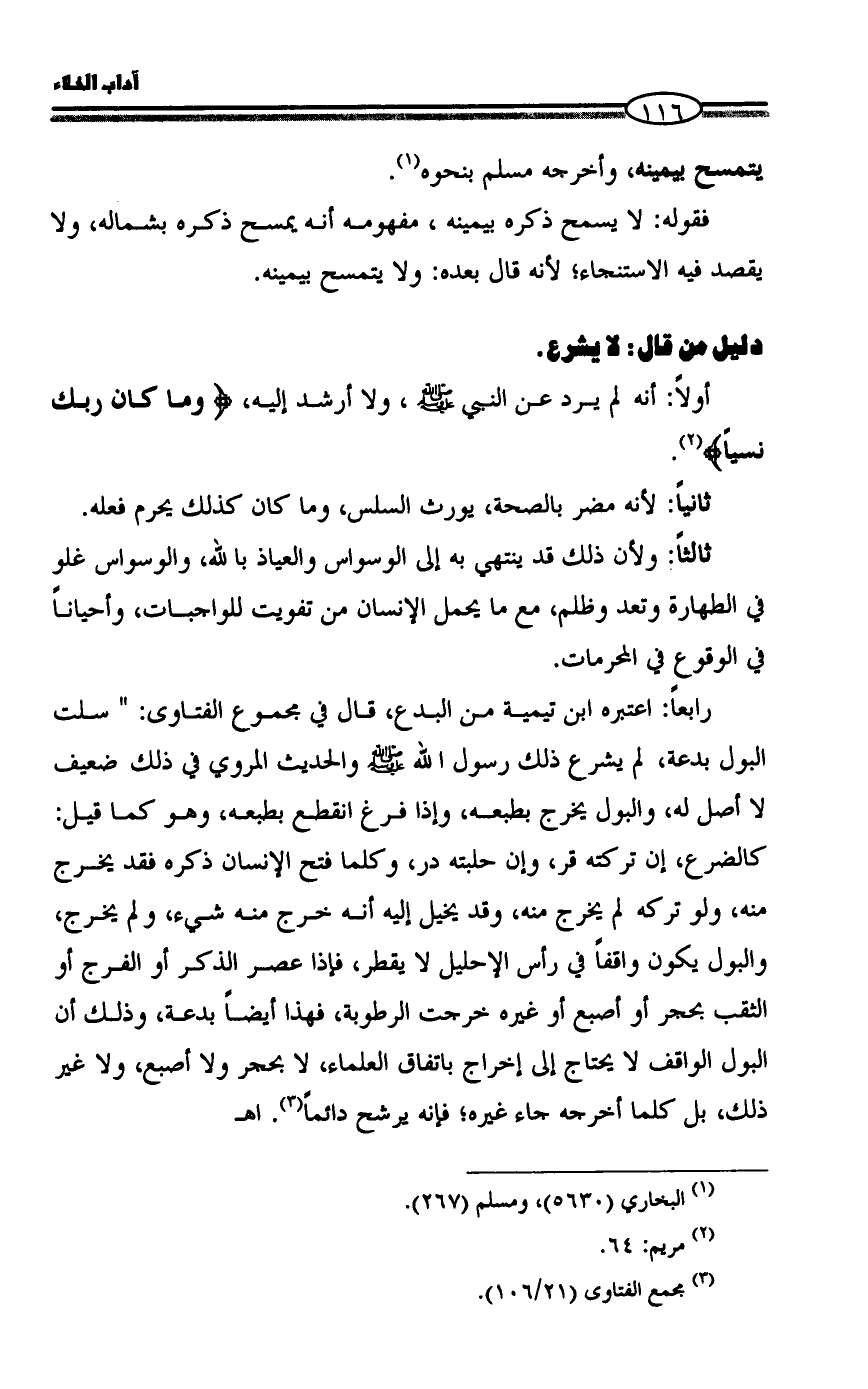 رابعاً: اعتبره ابن تيمية من البدع، قال في مجموع الفتاوى: " سلت البول بدعة، لم يشرع ذلك رسول الله - صلى الله عليه وسلم - والحديث المروي في ذلك ضعيف لا أصل له، والبول يخرج بطبعه، وإذا فرغ انقطع بطبعه، وهو كما قيل: كالضرع، إن تركته قر، وإن حلبته در، وكلما فتح الإنسان ذكره فقد يخرج منه، ولو تركه لم يخرج منه، وقد يخيل إليه أنه خرج منه شيء، ولم يخرج، والبول يكون واقفاً في رأس الإحليل لا يقطر، فإذا عصر الذكر أو الفرج أو الثقب بحجر أو أصبع أو غيره خرجت الرطوبة، فهذا أيضاً بدعة، وذلك أن البول الواقف لا يحتاج إلى إخراج باتفاق العلماء، لا بحجر ولا أصبع، ولا غير ذلك، بل كلما أخرجه جاء غيره؛ فإنه يرشح دائماً (¬٣). اهـ