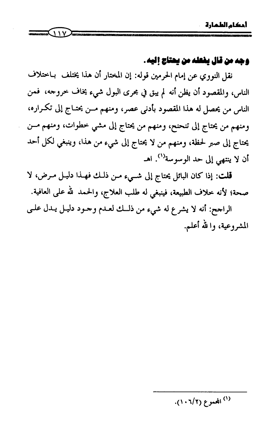 نقل النووي عن إمام الحرمين قوله: إن المختار أن هذا يختلف باختلاف الناس، والمقصود أن يظن أنه لم يبق في مجرى البول شيء يخاف خروجه، فمن الناس من يحصل له هذا المقصود بأدنى عصر، ومنهم من يحتاج إلى تكراره، ومنهم من يحتاج إلى تنحنح، ومنهم من يحتاج إلى مشي خطوات، ومنهم من يحتاج إلى صبر لحظة، ومنهم من لا يحتاج إلى شيء من هذا، وينبغي لكل أحد أن لا ينتهي إلى حد الوسوسة (¬١). اهـ
