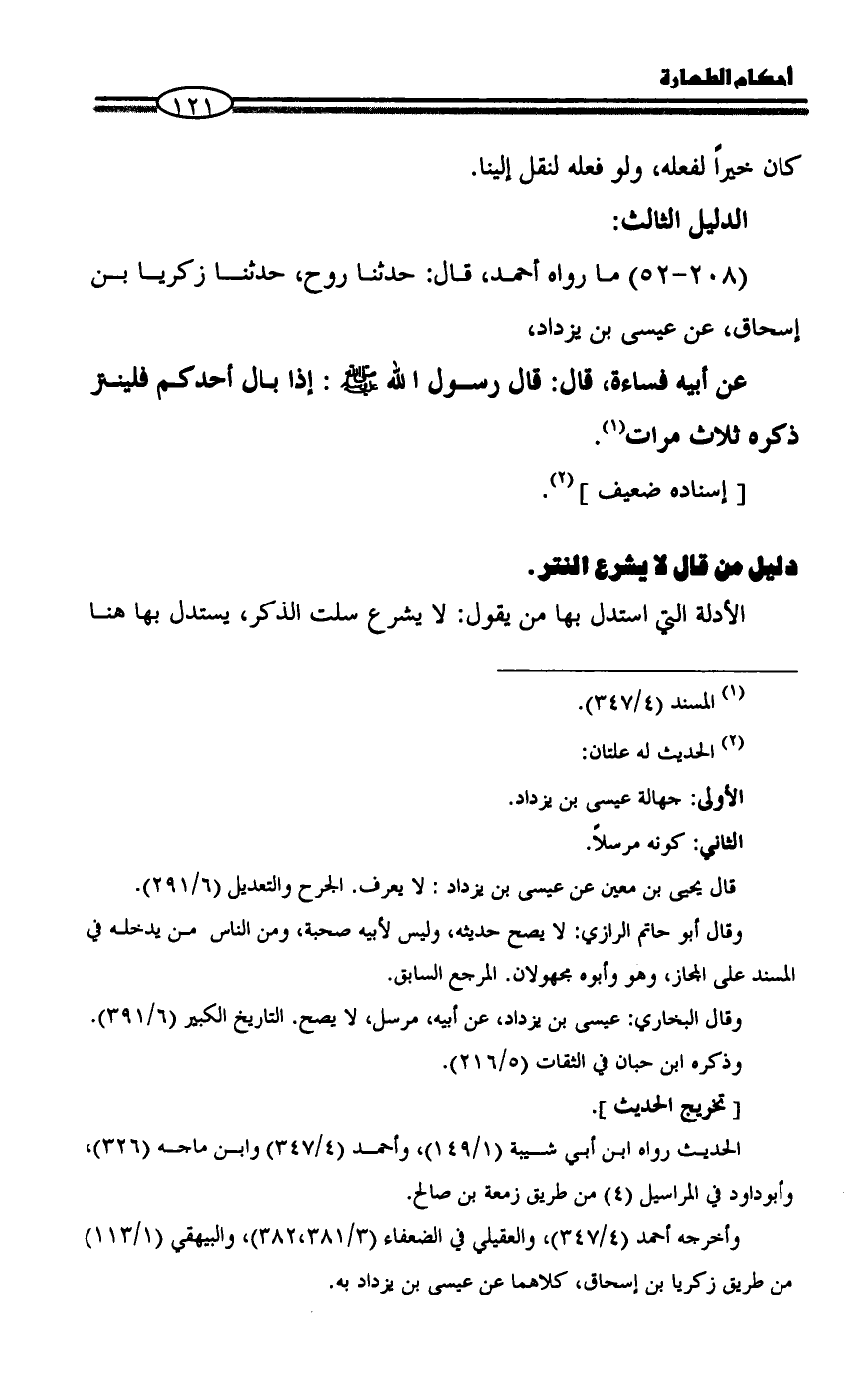 عن أبيه فساءة، قال: قال رسول الله - صلى الله عليه وسلم -: إذا بال أحدكم فلينتر ذكره ثلاث مرات (¬١).