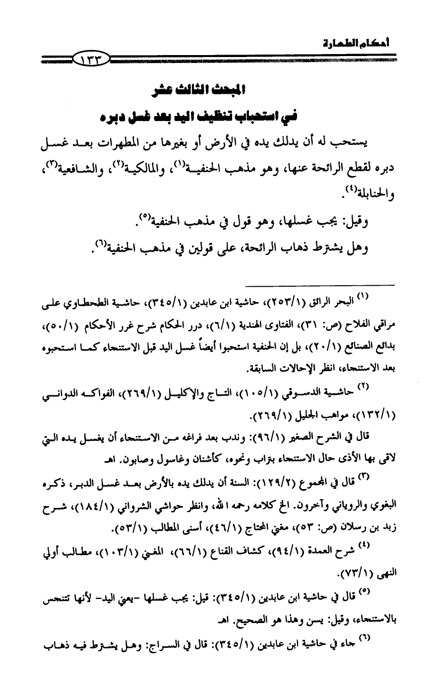 المبحث الثالث عشر في استحباب تنظيف اليد بعد غسل دبره